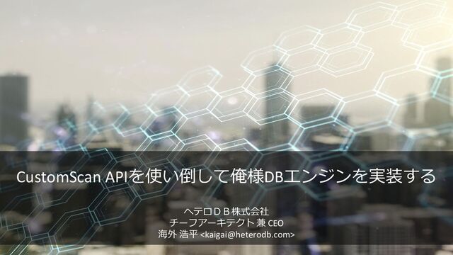 functions for asynchronous execution */ bool IsForeignPathAsyncCapable(ForeignPath *path); ForeignPathが非同期実行をサポートしているかどうかを オプティマイザに通知する void ForeignAsyncRequest(AsyncRequest *areq); リモートサーバから非同期に受け取ったタプルを一つ、 呼び出し元へ返す、またはareq->callback_pending=trueを セットして結果待ちである事を呼び出し元に知らせる、あるい はスロットにNULLをセットして終端に達した事を知らせる。 void ForeignAsyncConfigureWait(AsyncRequest *areq); 結果待ちである場合、WaitEventSetWait()の対象となる ファイルディスクリプタを追加する。 (読み出し可能となった時点でプロセスが起床する) void ForeignAsyncNotify(AsyncRequest *areq); 新たにリモートから処理結果を受け取ったら、そのタプルを 一つ、呼び出し元へ返す。 ① ForeignAsyncRequest(初回)を通じて、リモートサーバに 実行開始のリクエスト。 ② ForeignAsyncConfigureWaitにより同期イベントをセット ③ リモート実行中に、同期実行できるものを実行 ④ 結果が返ってきていれば、ForeignAsyncNotifyを通じ て結果を取得。一行を返す。 Append Foreign Scan on ① Foreign Scan on ② Foreign Scan on ③ SeqScan on ④
