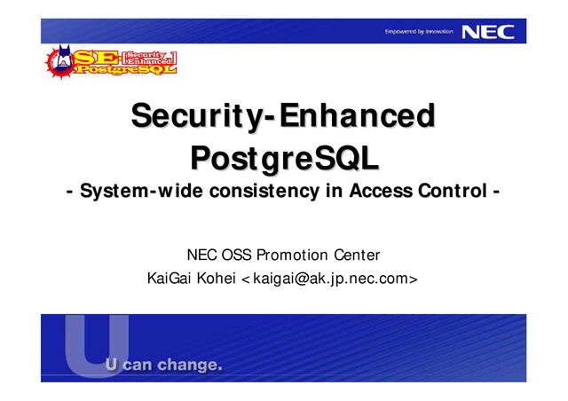SELinux to run. Is SE-PostgreSQL available on disabled SELinux? Is SE-PostgreSQL available on any other operating system? PostgreSQL Access Control Extension (PGACE) A set of platform independent hooks To apply various kind of security module with minimum impact ExecInsert Base PostgreSQL implementation pgaceHeapTupleInsert sepgsqlHeapTupleInsert fooHeapTupleInsert varHeapTupleInsert static inline bool pgaceHeapTupleInsert(Relation rel, HeapTuple tup,...) { #ifdef HAVE_SELINUX if (sepgsqlIsEnabled()) return sepgsqlHeapTupleInsert(rel, tup, ...); #endif return true; } static inline bool pgaceHeapTupleInsert(Relation rel, HeapTuple tup,...) { #ifdef HAVE_SELINUX if (sepgsqlIsEnabled()) return sepgsqlHeapTupleInsert(rel, tup, ...); #endif return true; } database PGACE framework OS specific security module