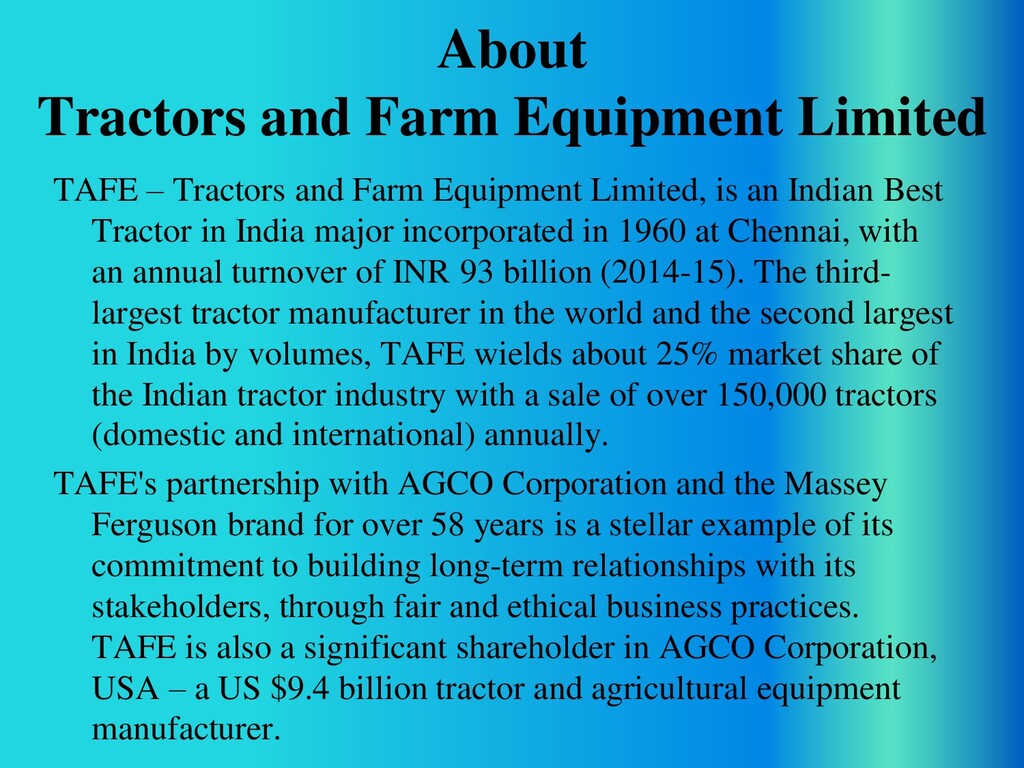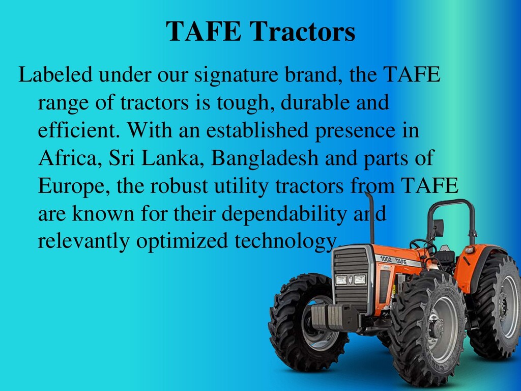 TAFE Tractors are known for their dependability and superior technology. Built to the taste of the land, a TAFE tractor is synonymous to toughness and stands for high standards of precision build quality, housing the expertise of TAFE acquired over decades of its being.