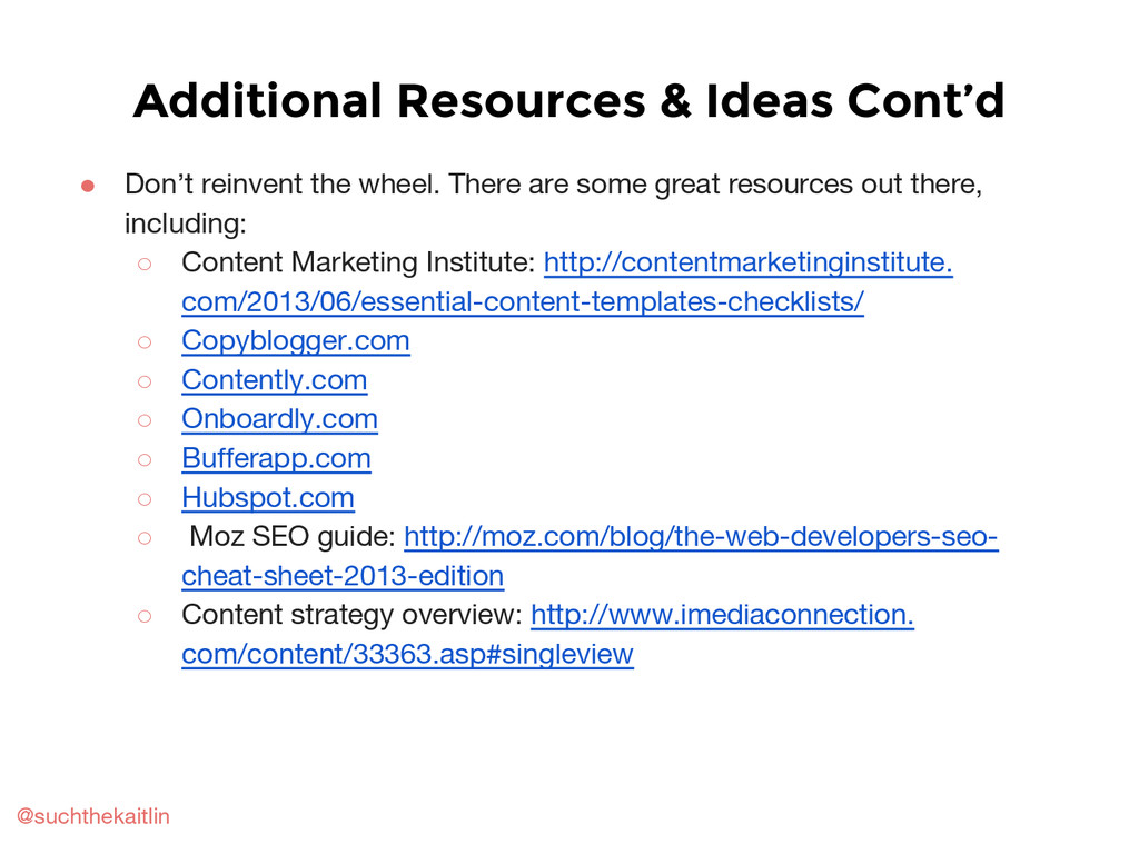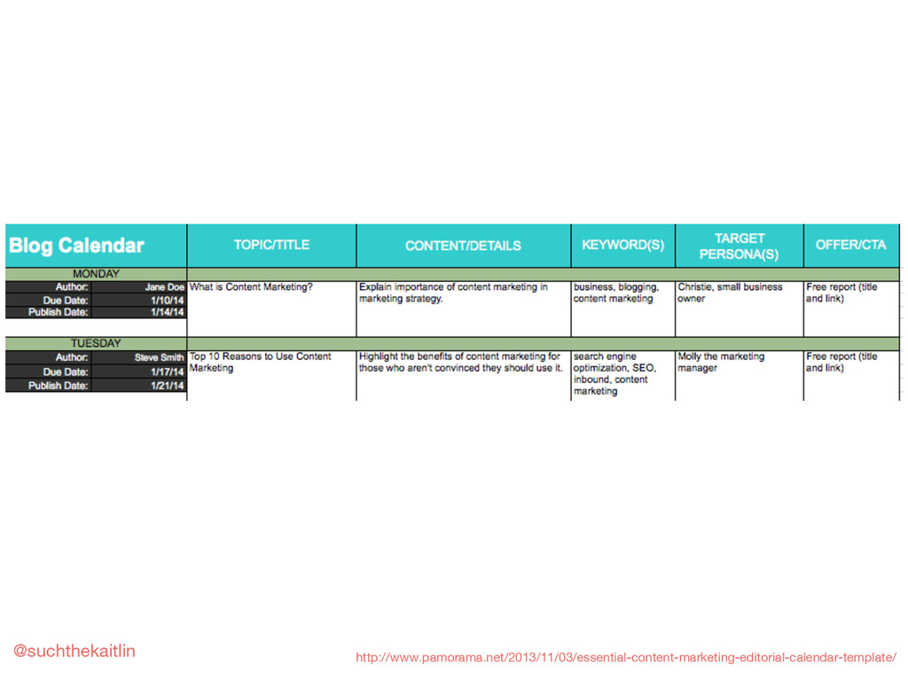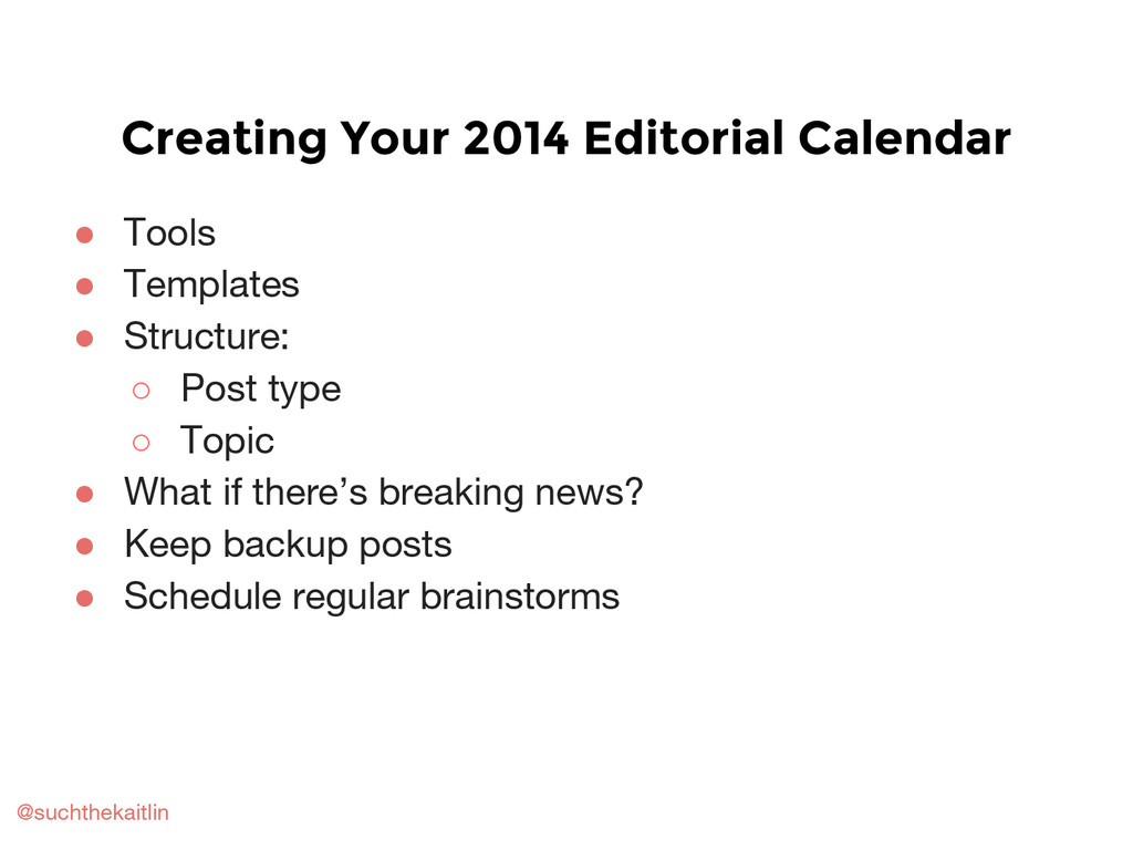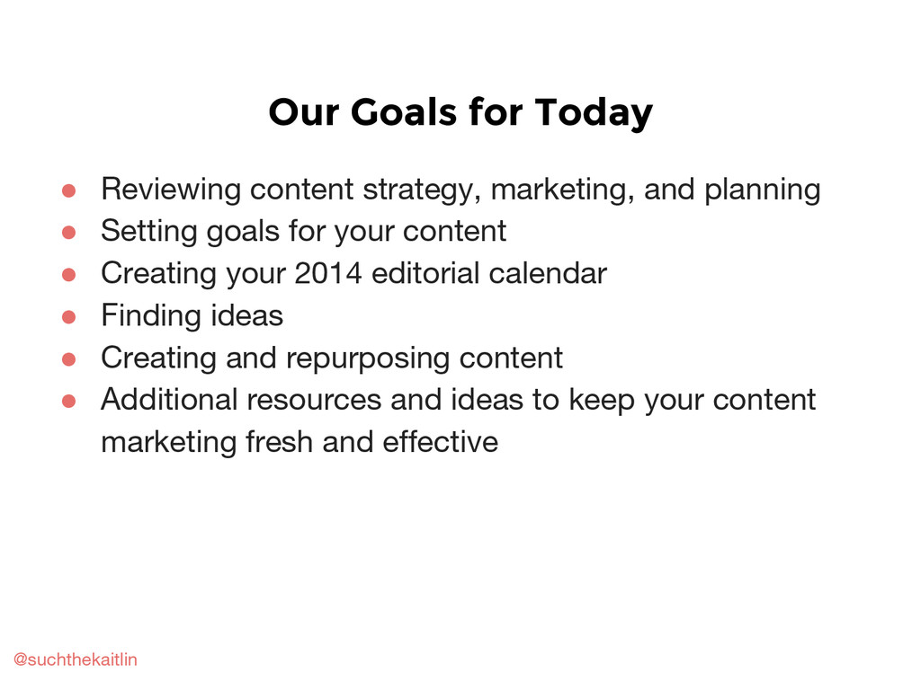Includes a basic overview of content strategy, marketing, and planning; how to create an editorial calendar; how to brainstorm and repurpose content; and other planning tips and resources.