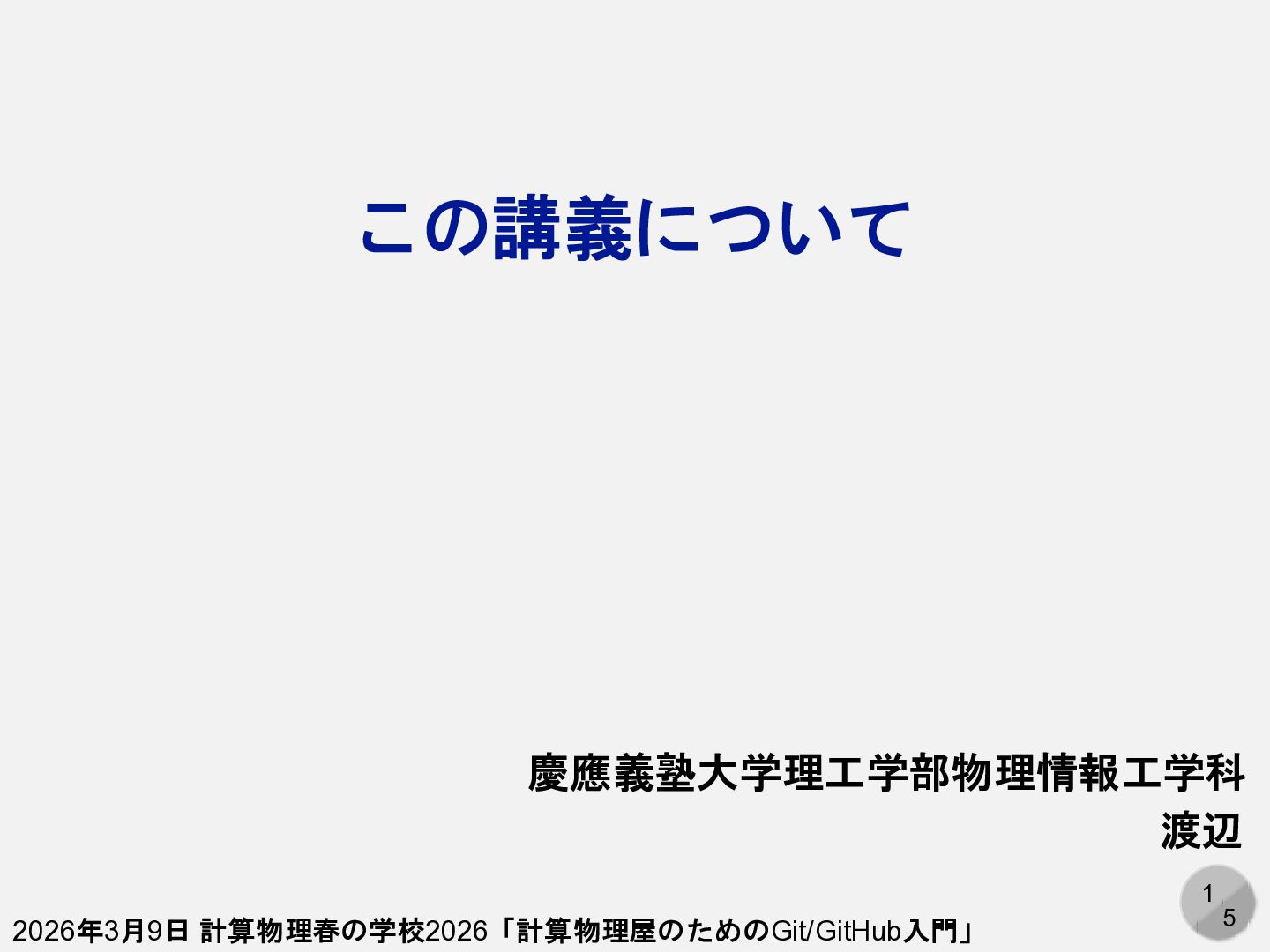 1 5 この講義について 慶應義塾大学理工学部物理情報工学科 渡辺 2026年3月9日 計算物理春の学校2026「計算物理屋のためのGit/GitHub入門」