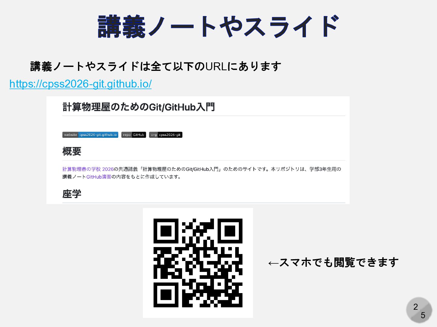 2 5 講義ノートやスライド https://cpss2026-git.github.io/ 講義ノートやスライドは全て以下のURLにあります ←スマホでも閲覧できます