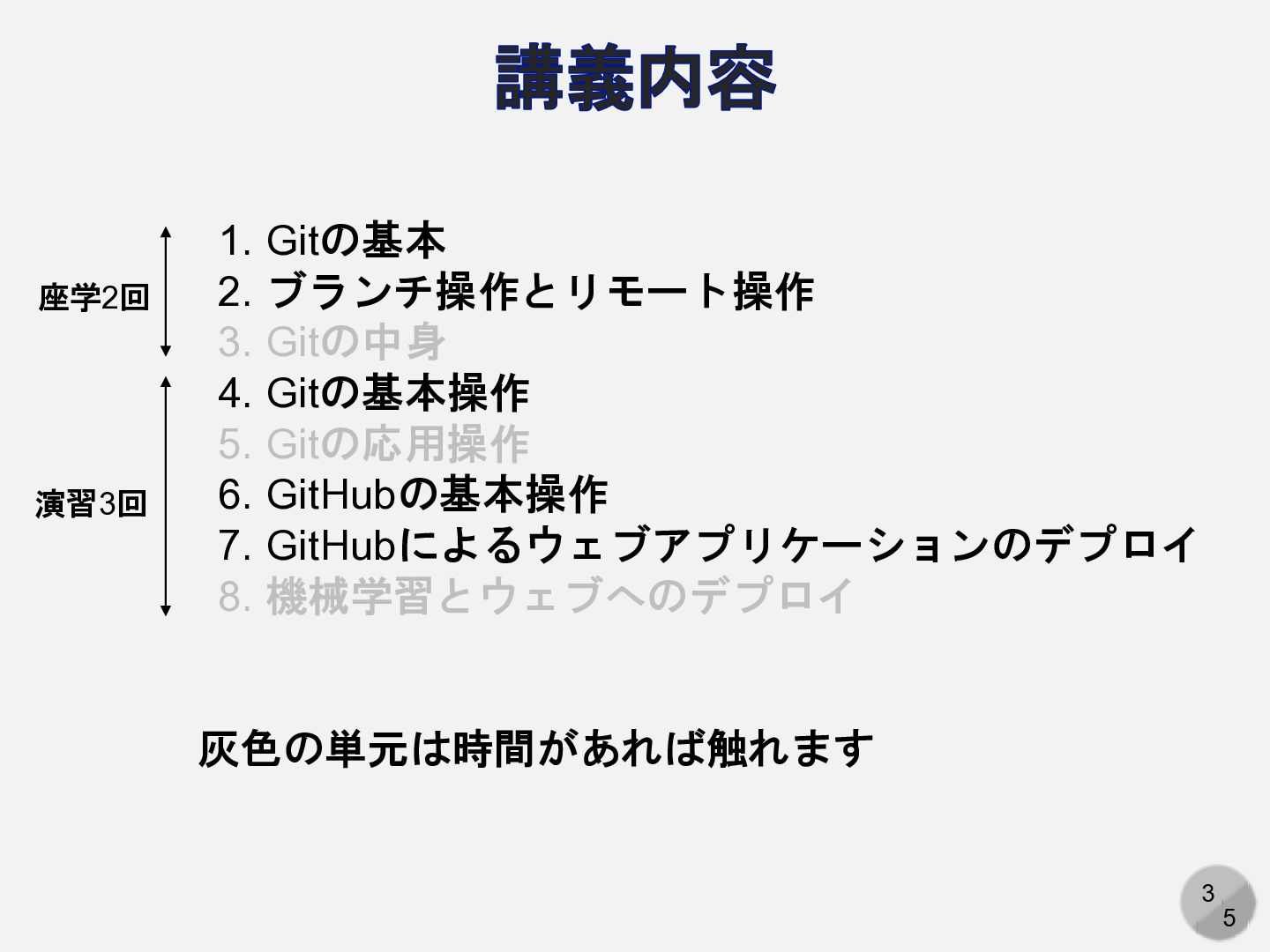 Gitの基本操作 5. Gitの応用操作 6. GitHubの基本操作 7. GitHubによるウェブアプリケーションのデプロイ 8. 機械学習とウェブへのデプロイ 座学2回 演習3回 灰色の単元は時間があれば触れます