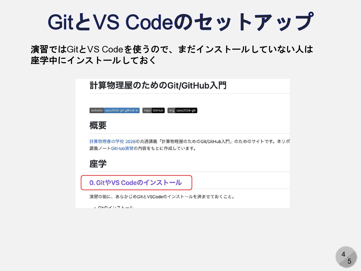 4 5 GitとVS Codeのセットアップ 演習ではGitとVS Codeを使うので、まだインストールしていない人は 座学中にインストールしておく