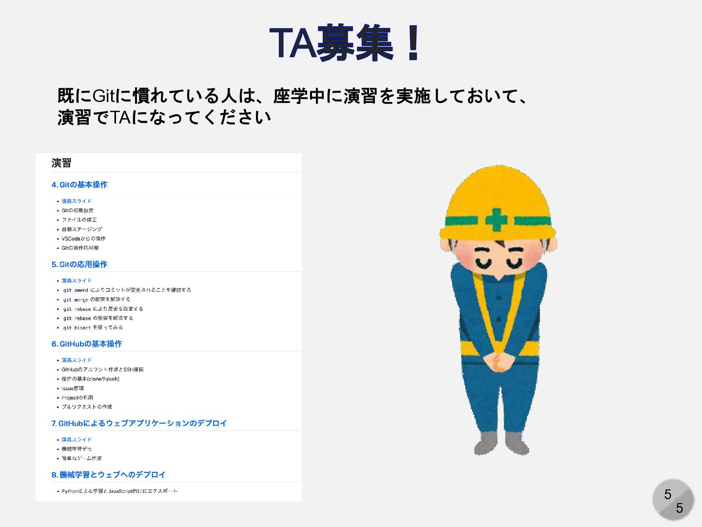 5 5 TA募集! 既にGitに慣れている人は、座学中に演習を実施しておいて、 演習でTAになってください