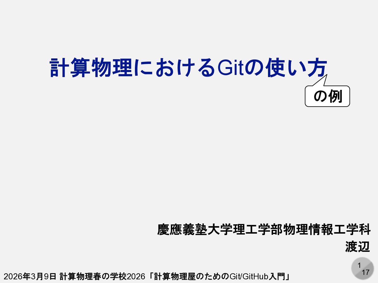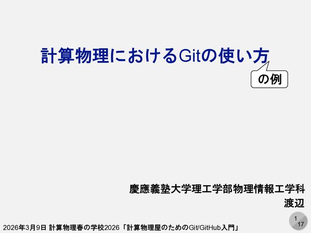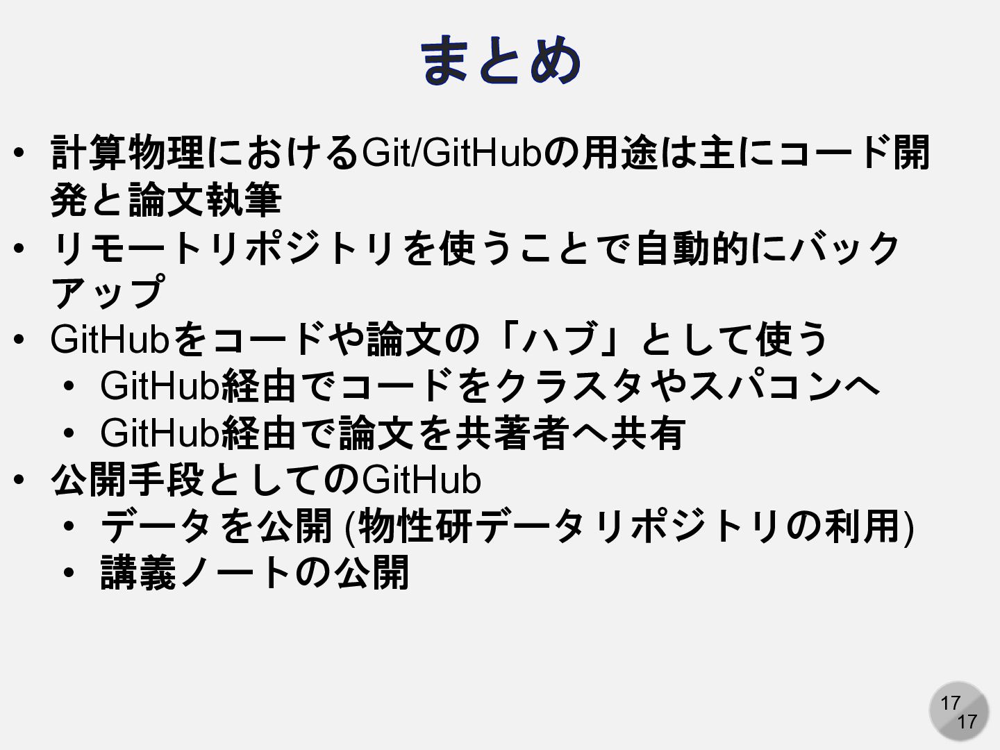 8. 17 17 まとめ • 計算物理におけるGit/GitHubの用途は主にコード開 発と論文執筆 • リモートリポジトリを使うことで自動的にバック アップ •