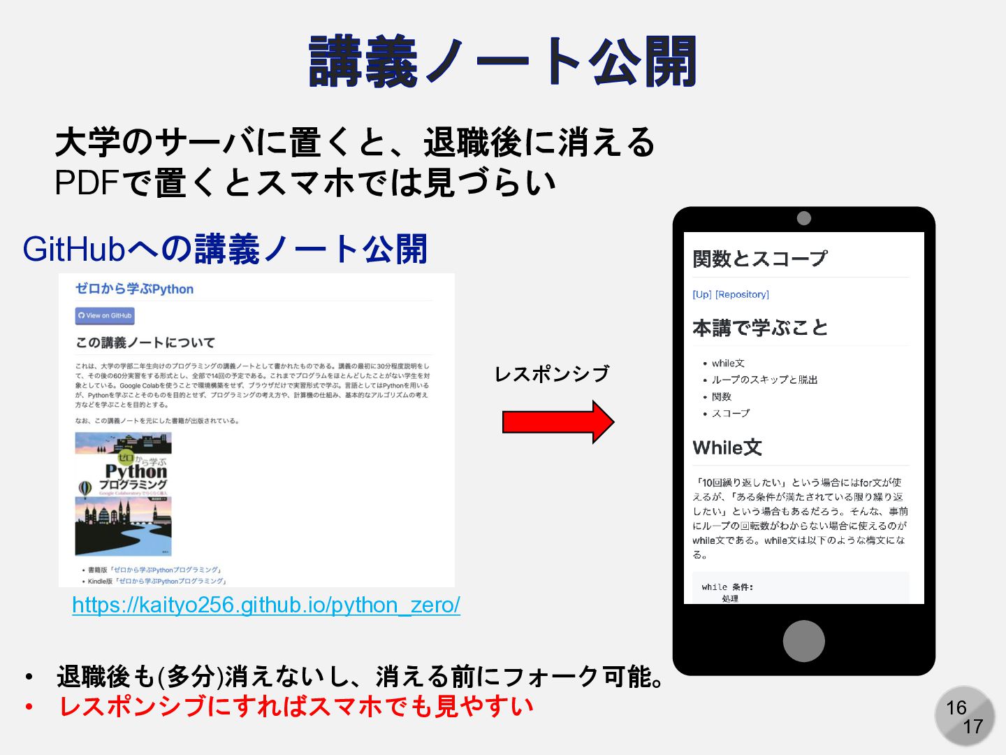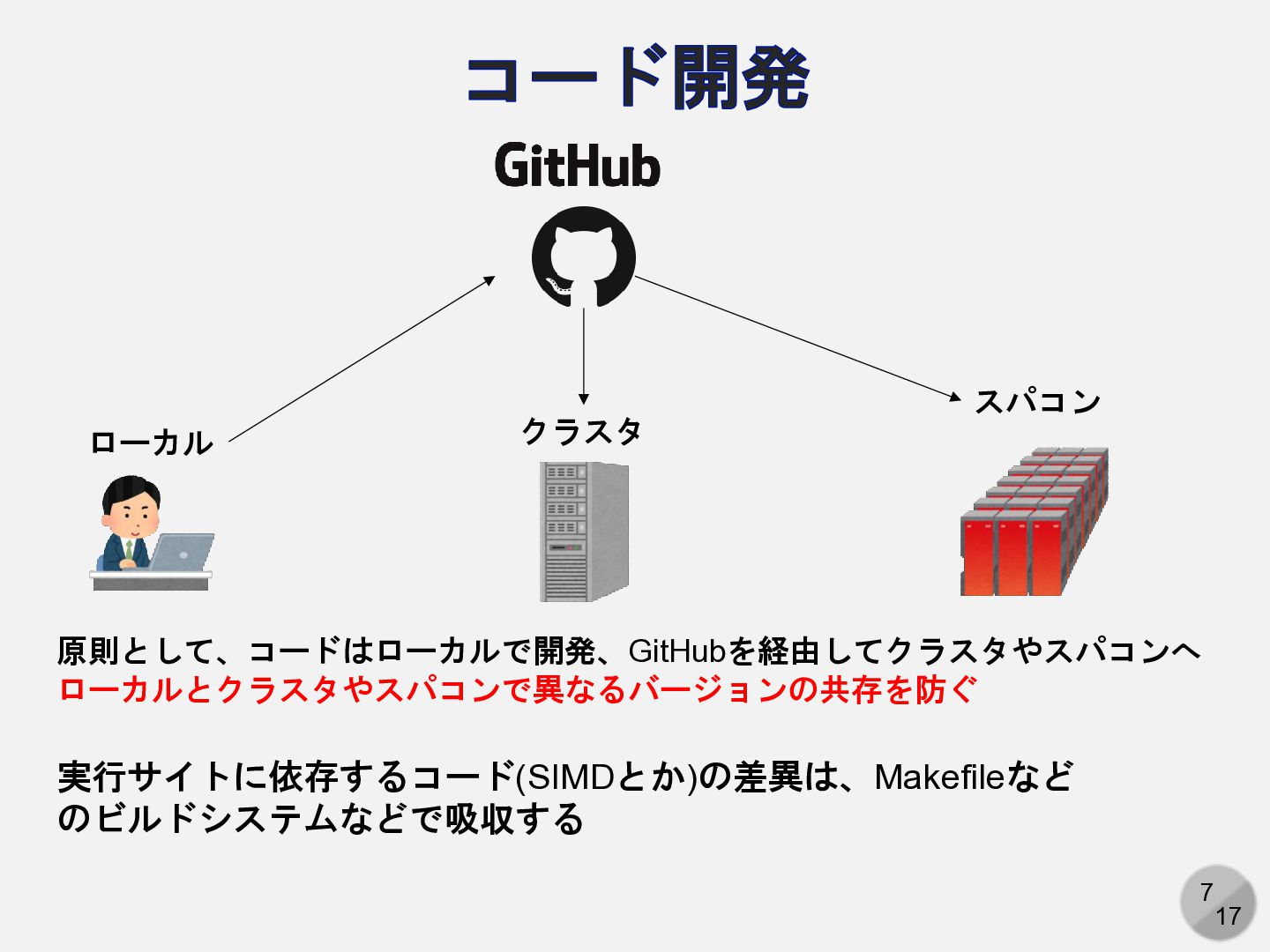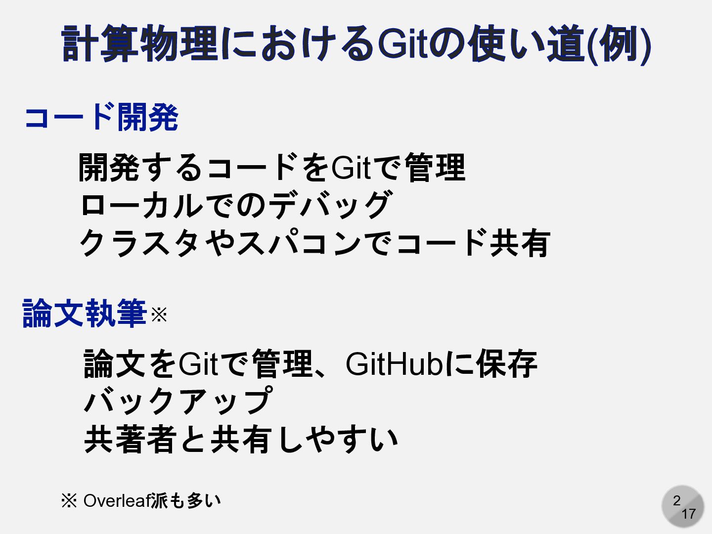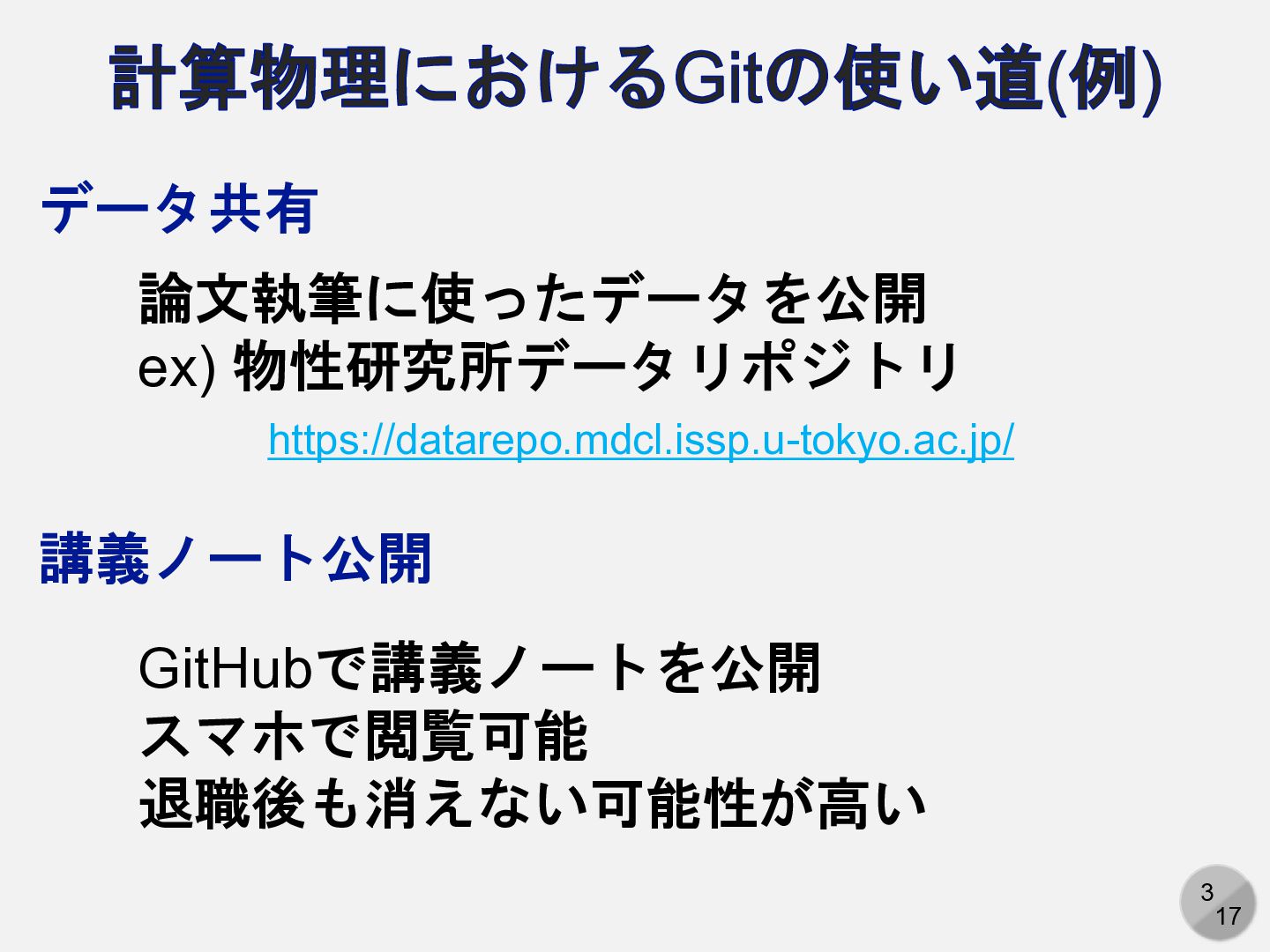 GitHubをコードや論文の「ハブ」として使う • GitHub経由でコードをクラスタやスパコンへ • GitHub経由で論文を共著者へ共有 • 公開手段としてのGitHub • データを公開 (物性研データリポジトリの利用) • 講義ノートの公開