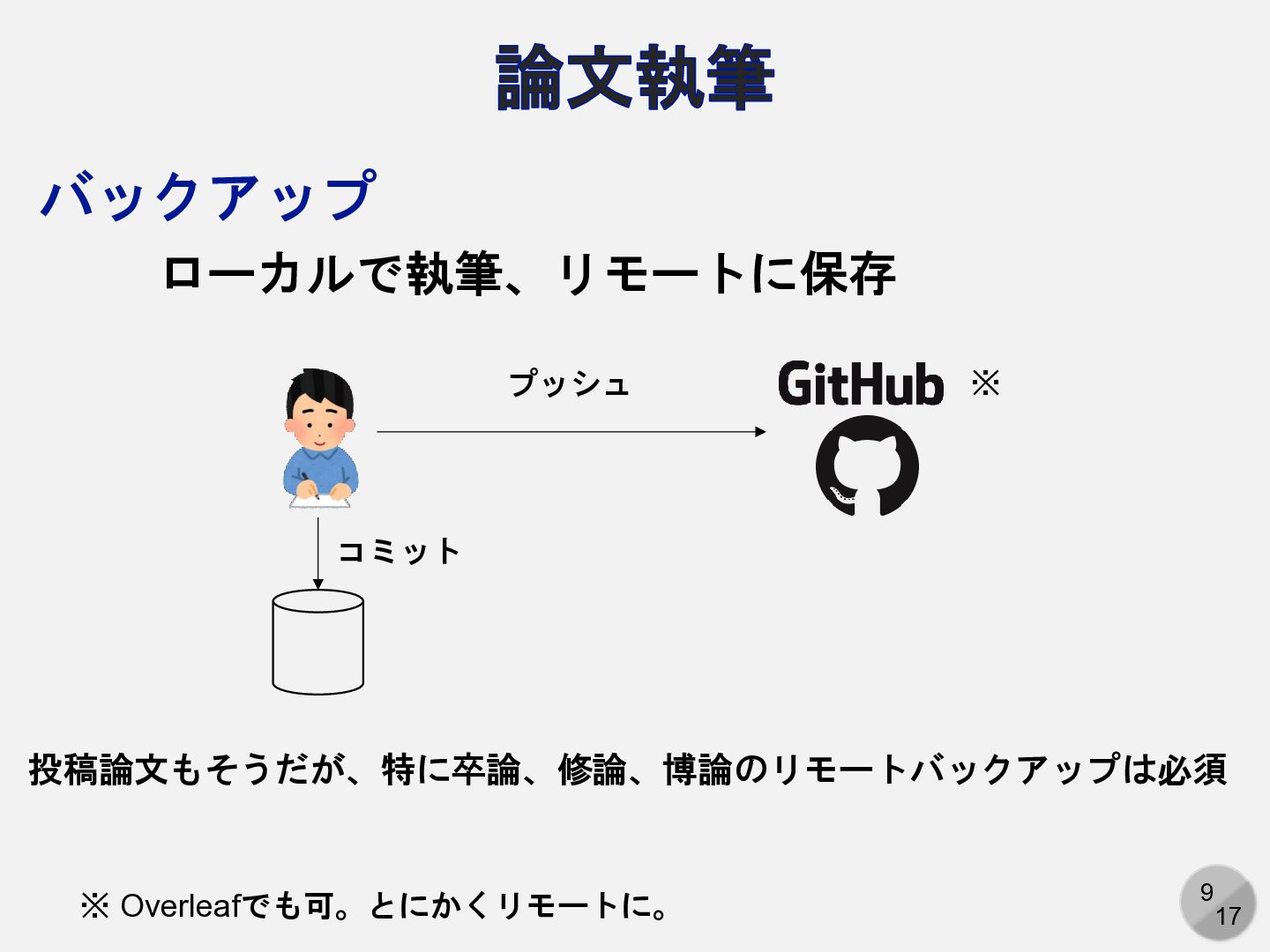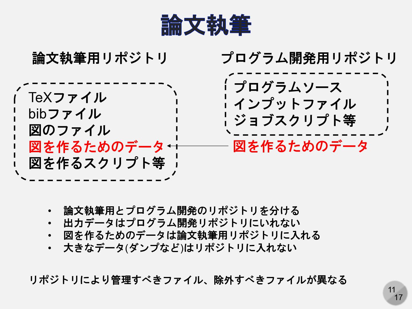 3. 11 17 論文執筆 TeXファイル bibファイル 図のファイル 図を作るためのデータ 図を作るスクリプト等 論文執筆用リポジトリ プログラム開発用リポジトリ