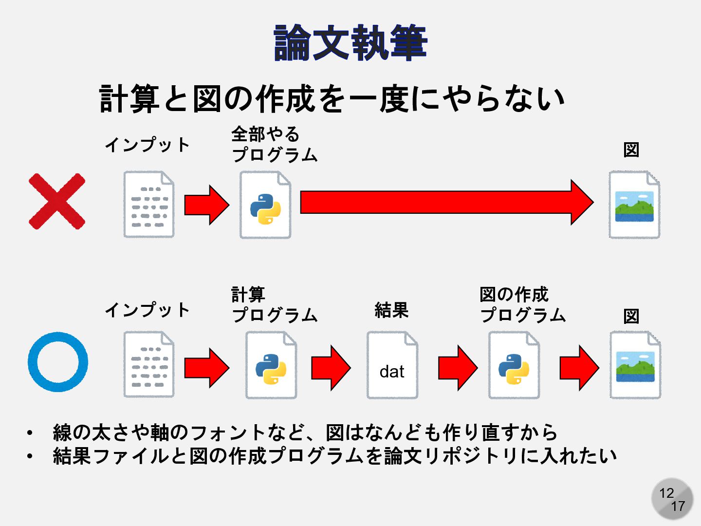 4. 12 17 論文執筆 計算と図の作成を一度にやらない インプット 全部やる プログラム 図 インプット 計算