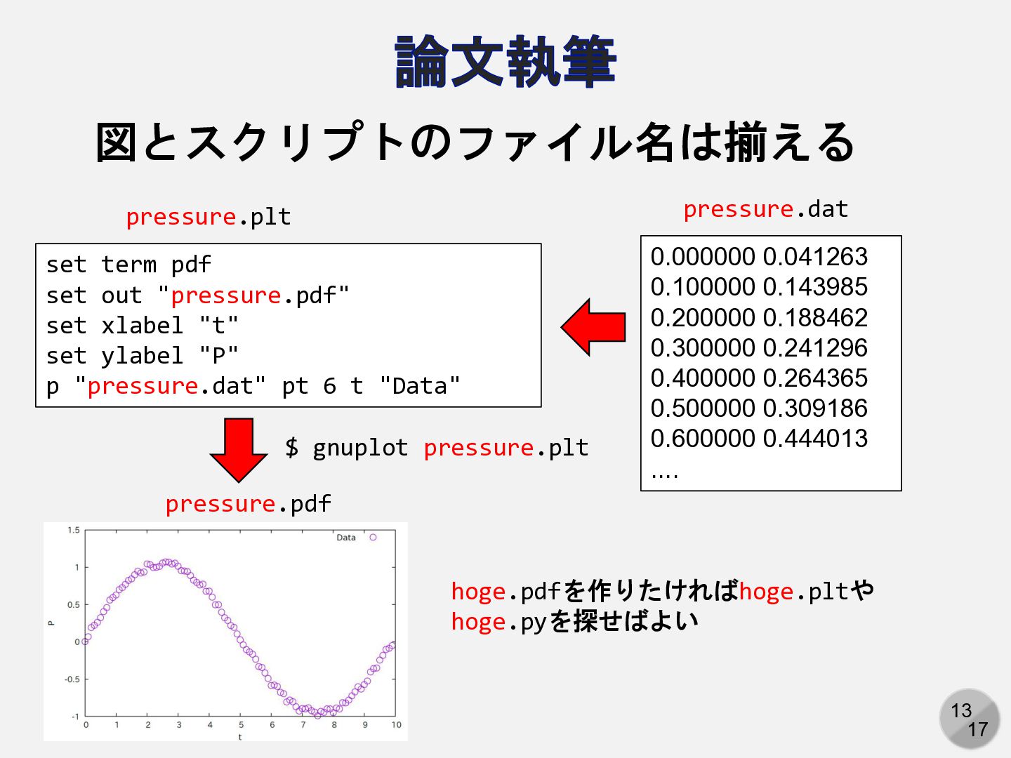 0.300000 0.241296 0.400000 0.264365 0.500000 0.309186 0.600000 0.444013 .... pressure.dat set term pdf set out "pressure.pdf" set xlabel "t" set ylabel "P" p "pressure.dat" pt 6 t "Data" pressure.plt $ gnuplot pressure.plt pressure.pdf hoge.pdfを作りたければhoge.pltや hoge.pyを探せばよい