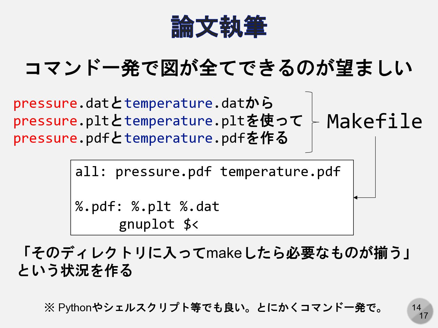 gnuplot $< Makefile pressure.datとtemperature.datから pressure.pltとtemperature.pltを使って pressure.pdfとtemperature.pdfを作る 「そのディレクトリに入ってmakeしたら必要なものが揃う」 という状況を作る ※ Pythonやシェルスクリプト等でも良い。とにかくコマンド一発で。