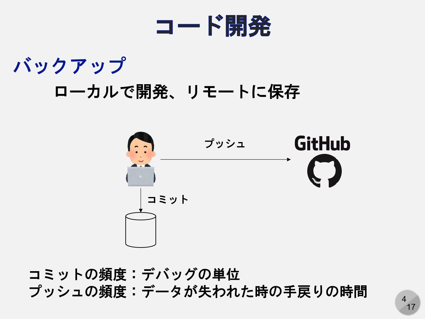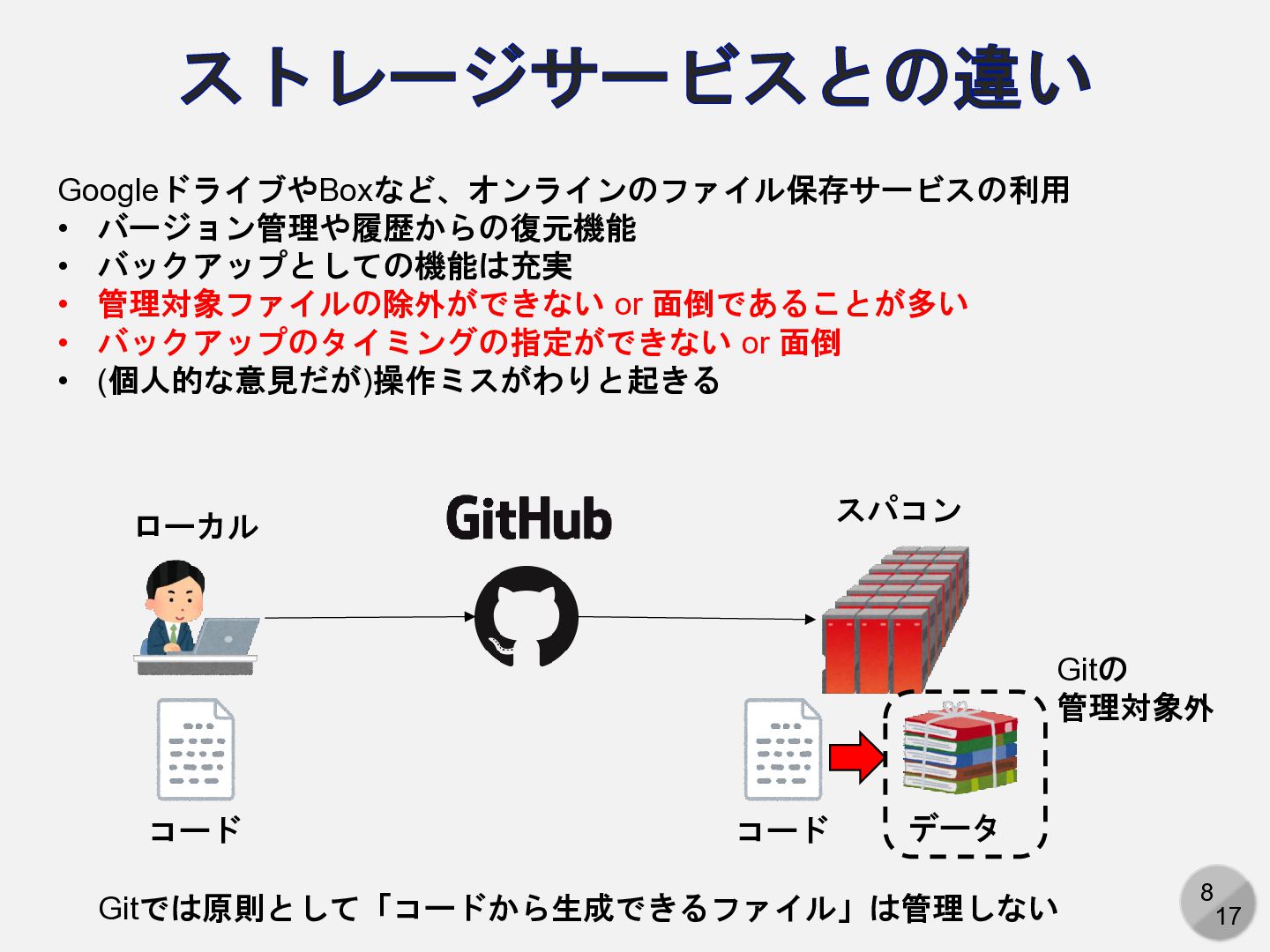 or 面倒であることが多い • バックアップのタイミングの指定ができない or 面倒 • (個人的な意見だが)操作ミスがわりと起きる ローカル スパコン コード コード データ Gitでは原則として「コードから生成できるファイル」は管理しない Gitの 管理対象外