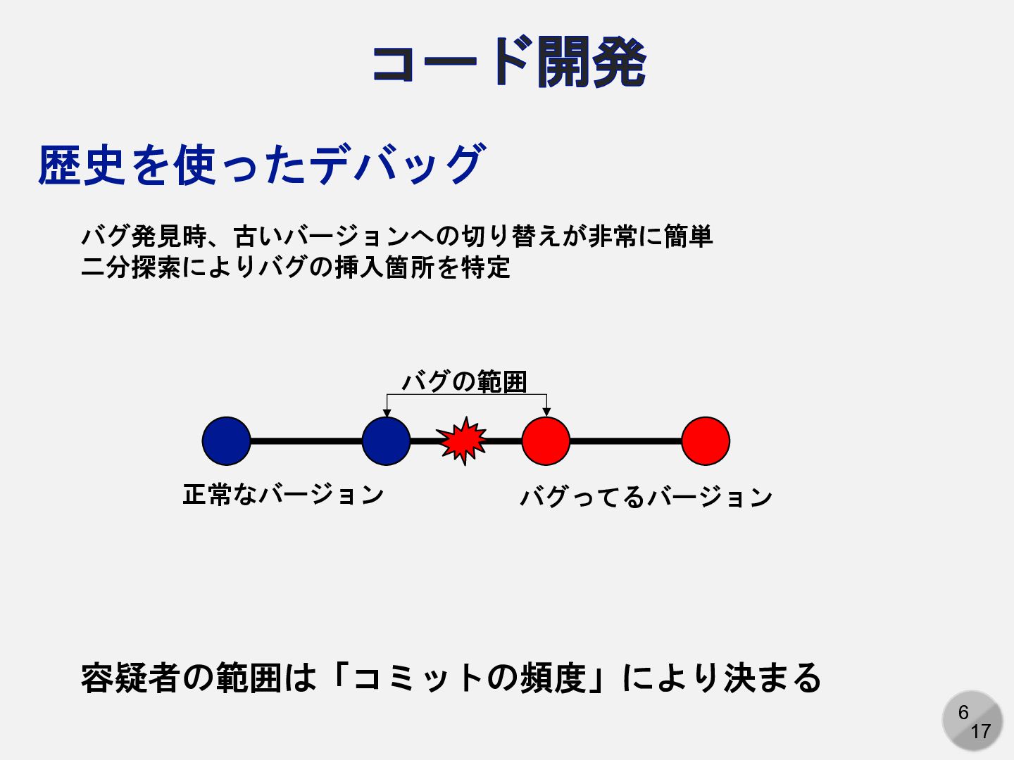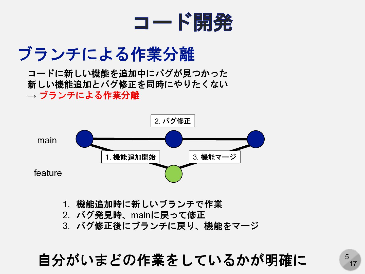 1. 5 17 コード開発 ブランチによる作業分離 main feature コードに新しい機能を追加中にバグが見つかった 新しい機能追加とバグ修正を同時にやりたくない → ブランチによる作業分離