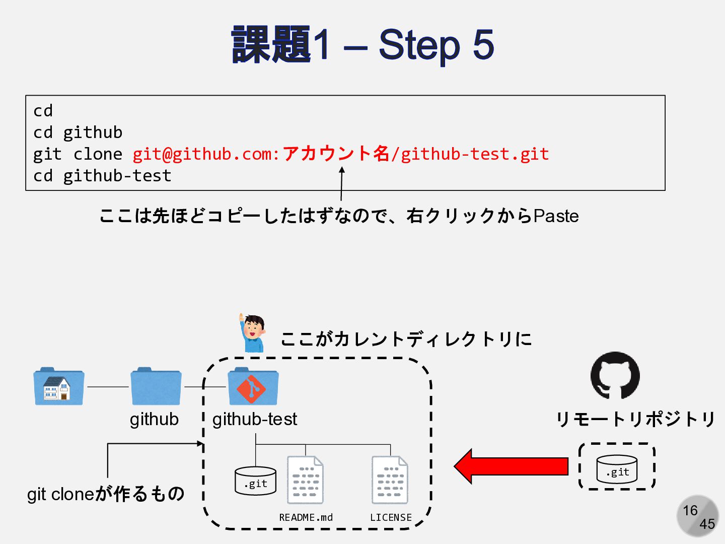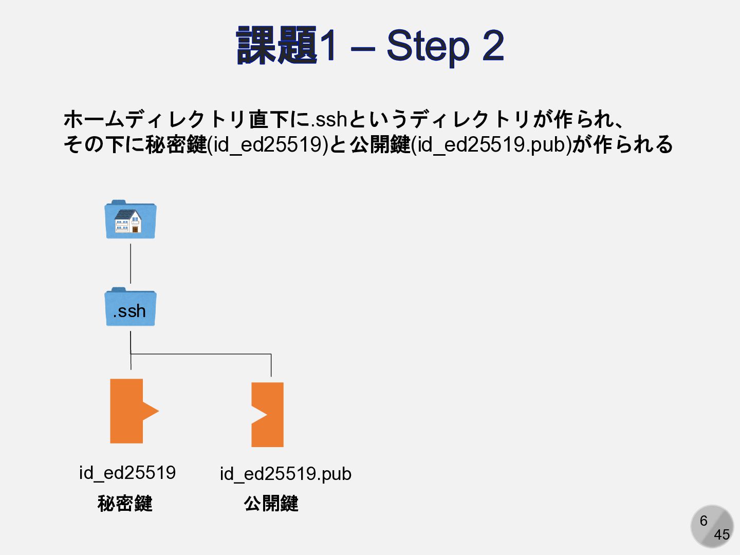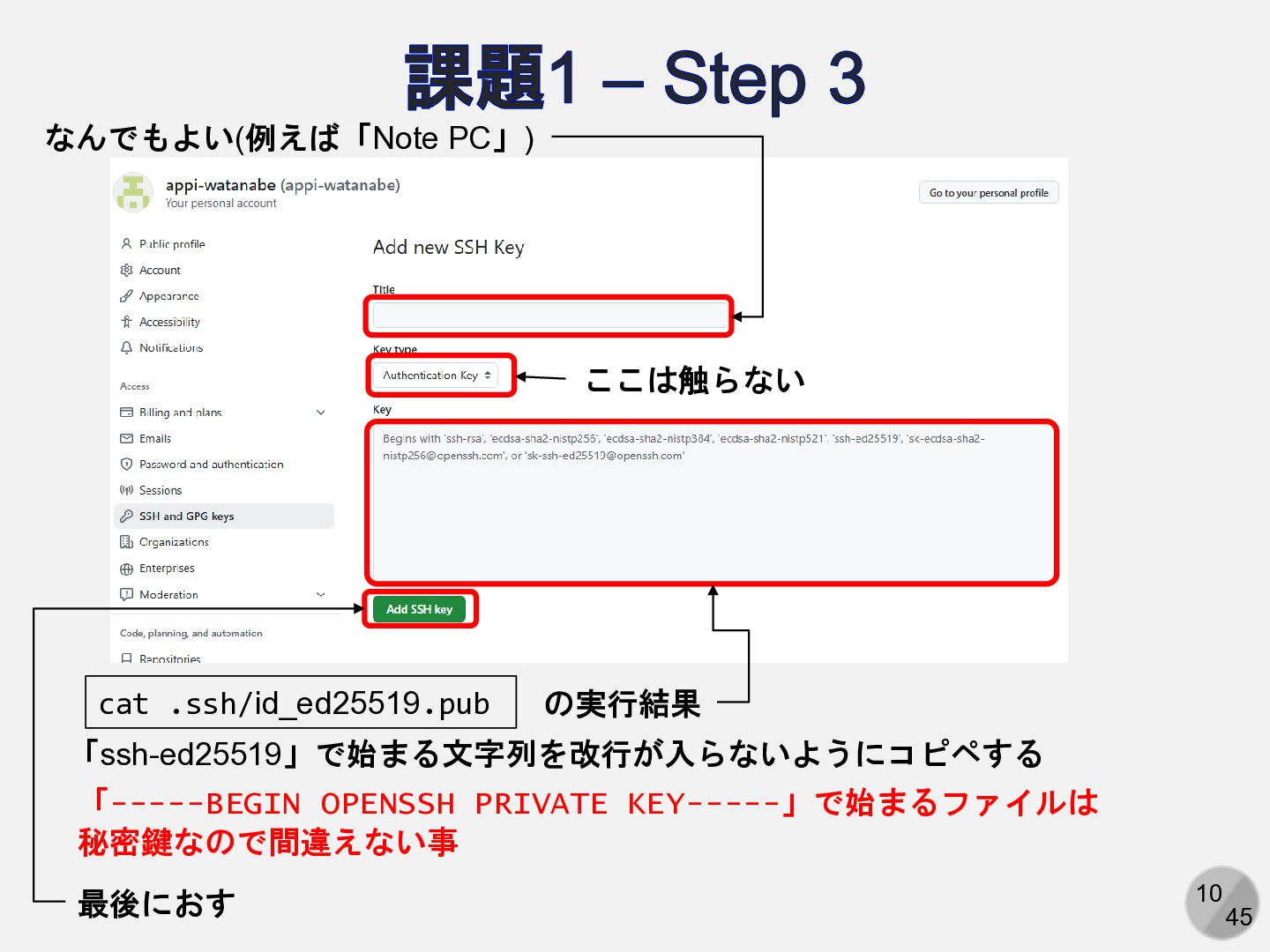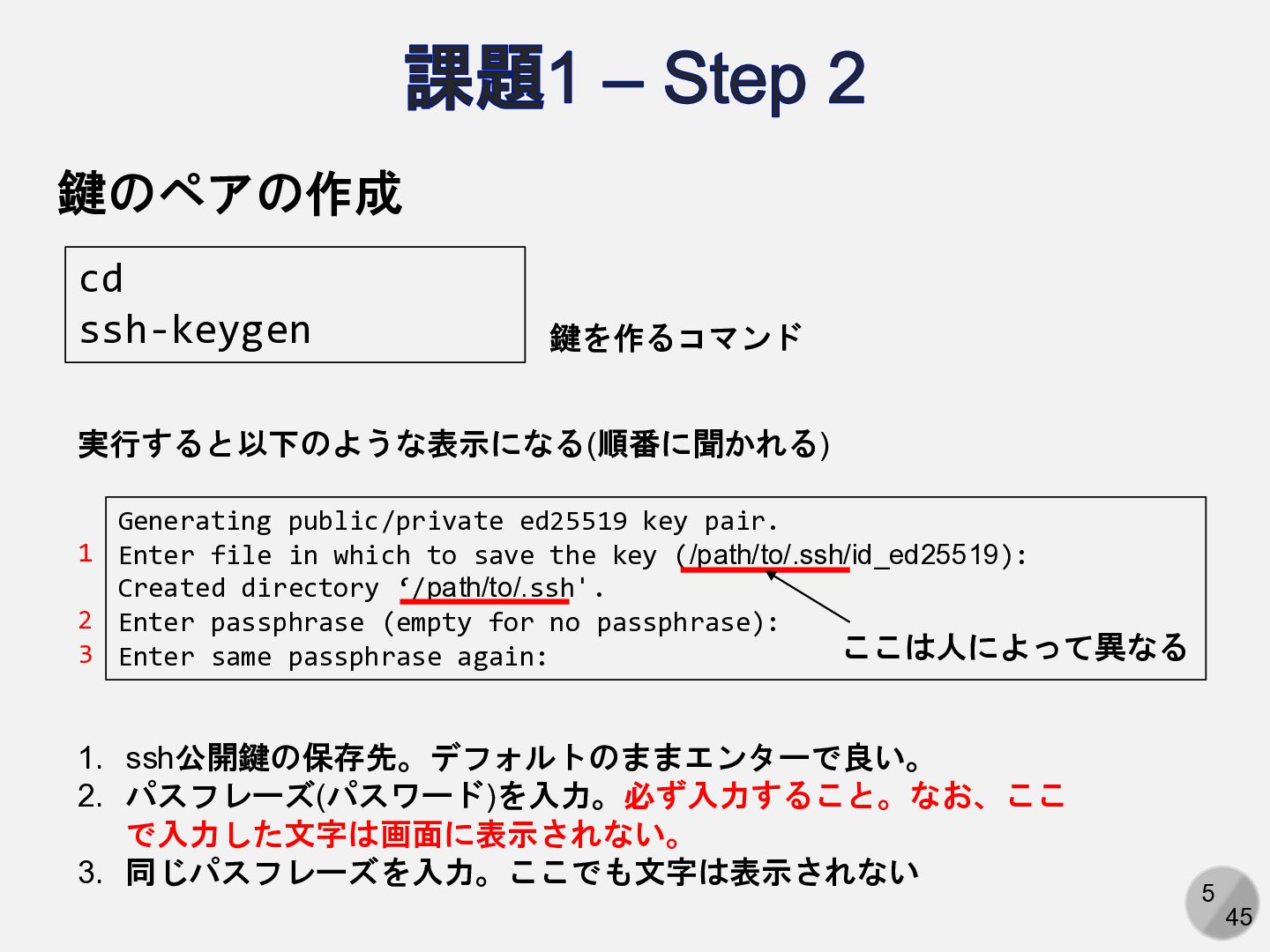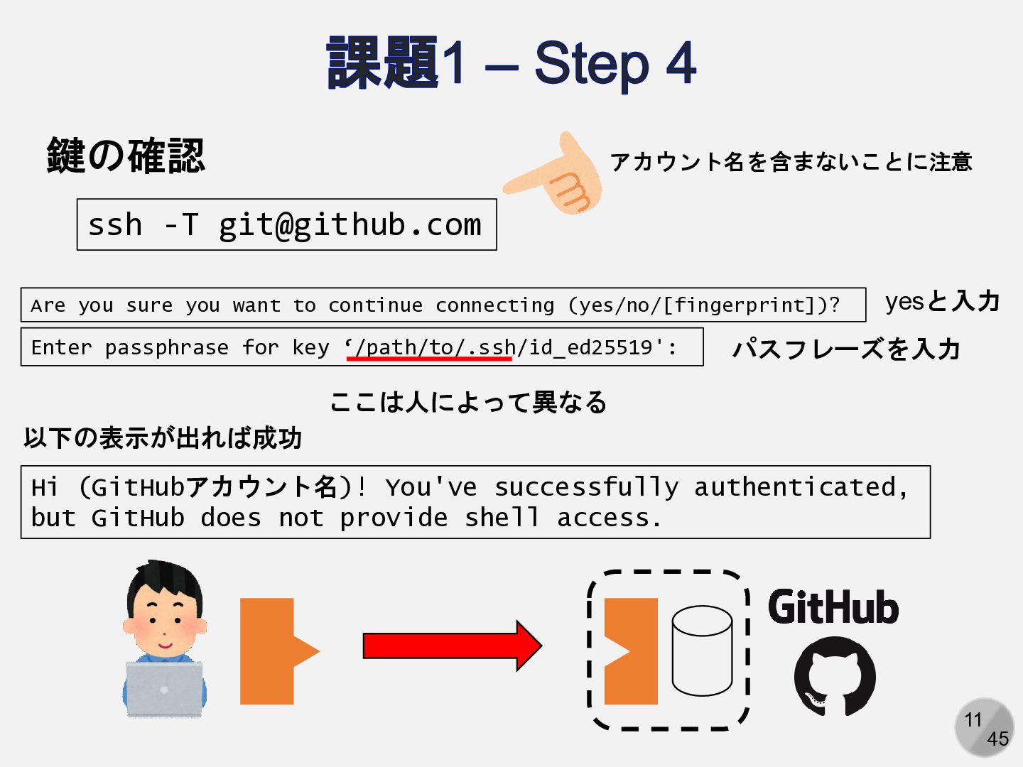 Are you sure you want to continue connecting (yes/no/[fingerprint])? yesと入力 Enter passphrase for key ‘/path/to/.ssh/id_ed25519': パスフレーズを入力 ここは人によって異なる Hi (GitHubアカウント名)! You've successfully authenticated, but GitHub does not provide shell access. 以下の表示が出れば成功 アカウント名を含まないことに注意