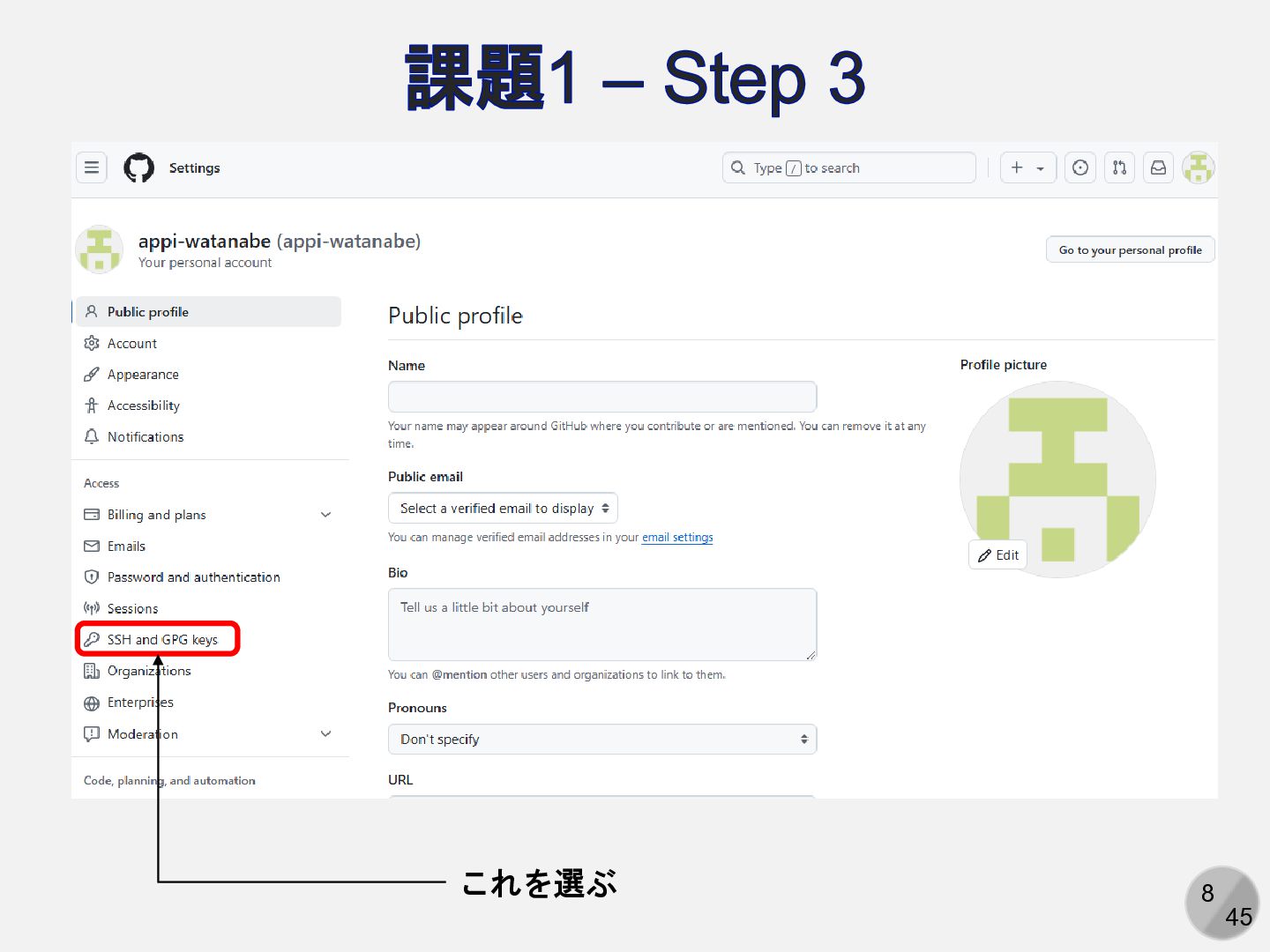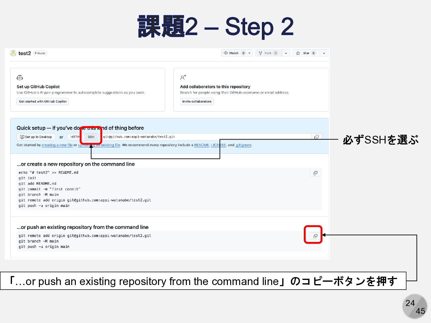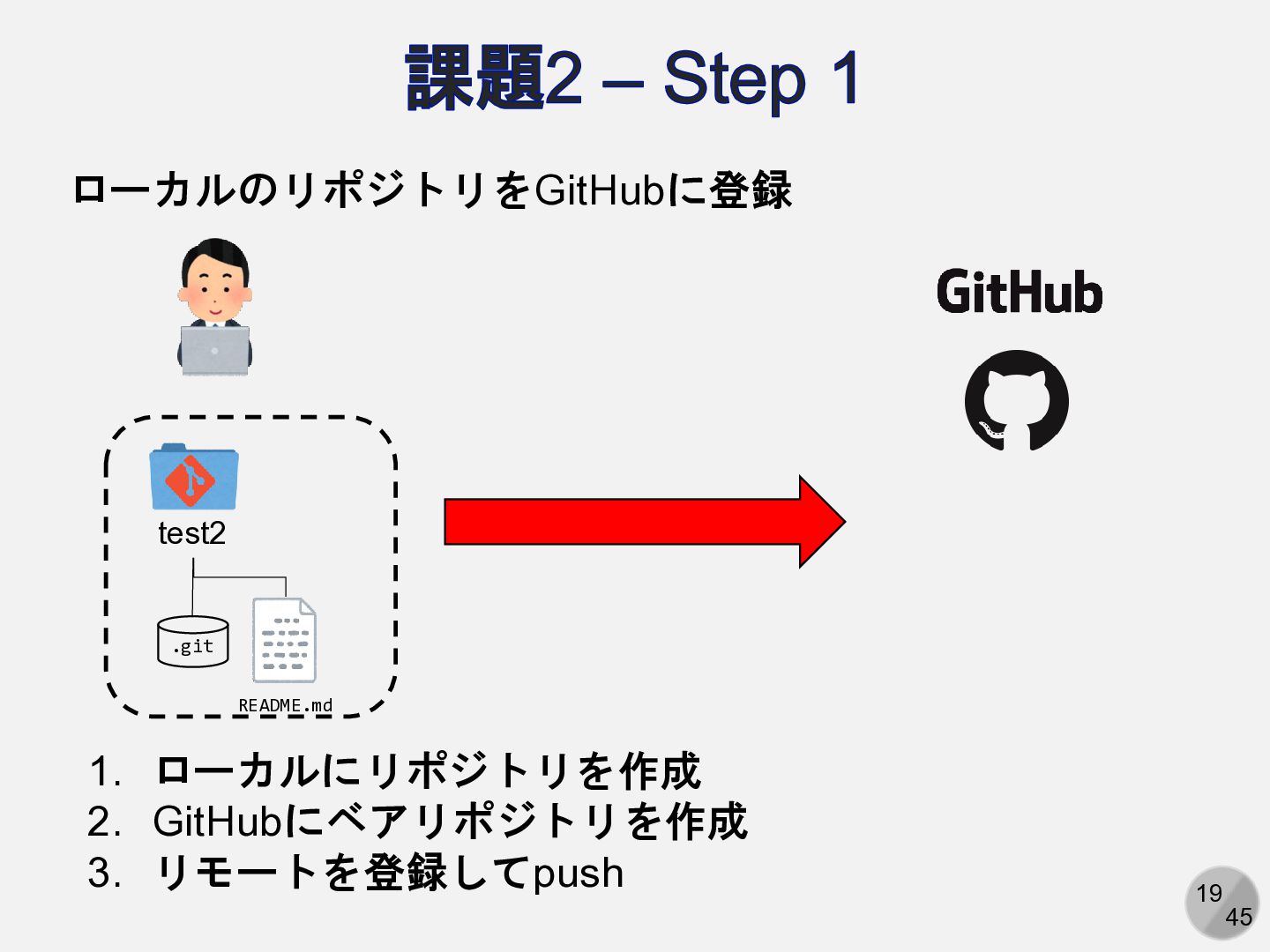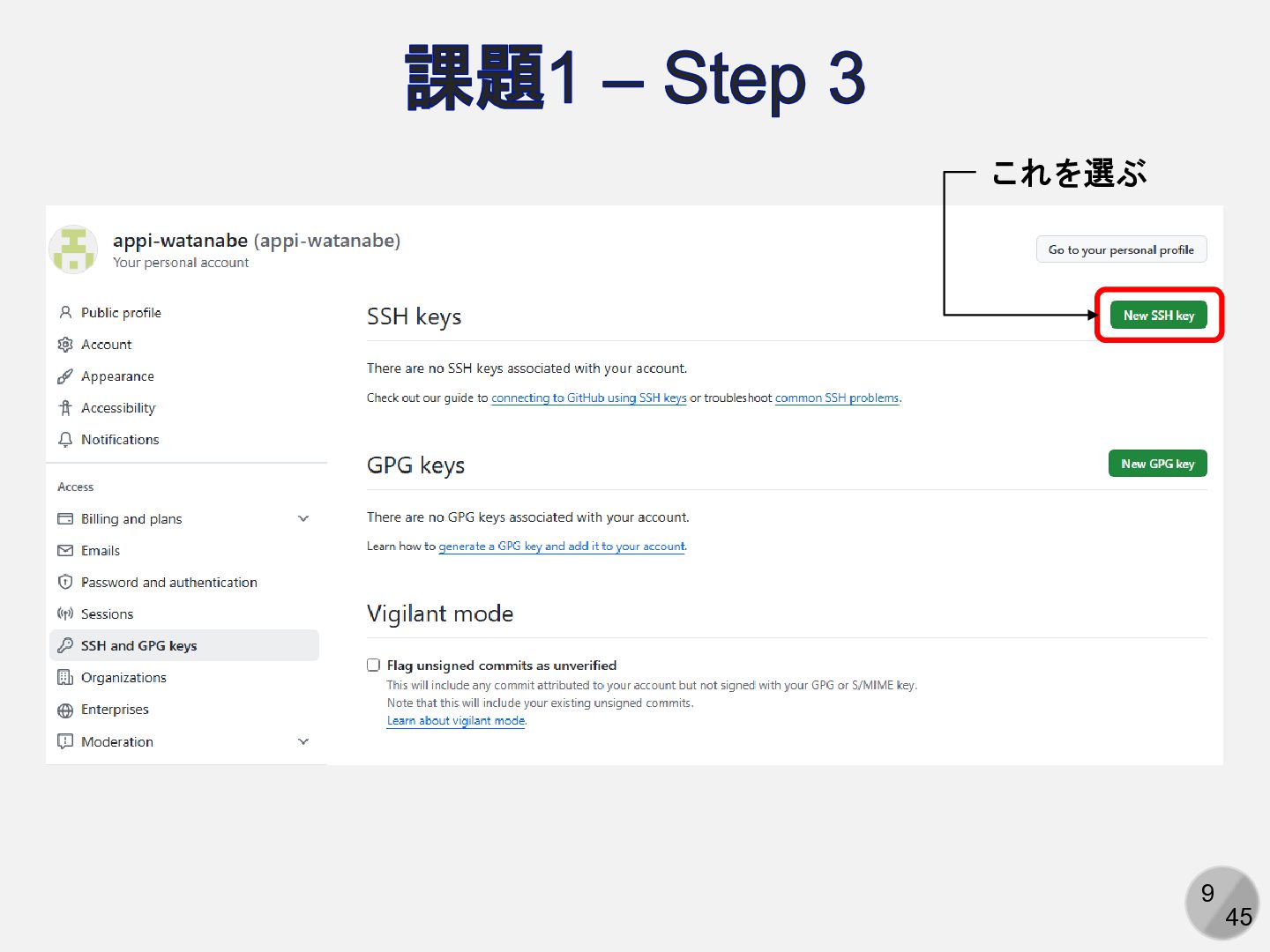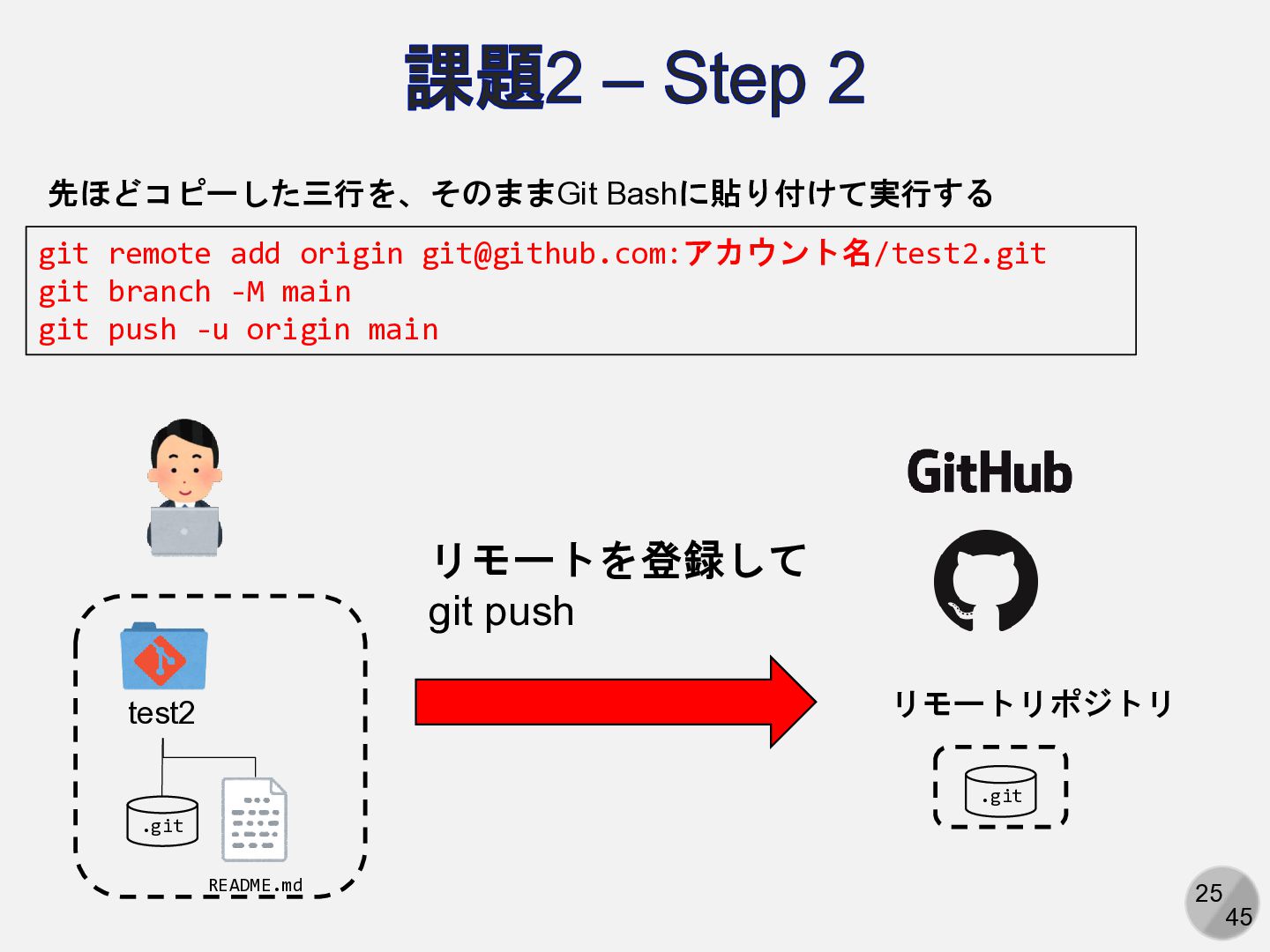 Are you sure you want to continue connecting (yes/no/[fingerprint])? yesと入力 Enter passphrase for key ‘/path/to/.ssh/id_ed25519': パスフレーズを入力 ここは人によって異なる Hi (GitHubアカウント名)! You've successfully authenticated, but GitHub does not provide shell access. 以下の表示が出れば成功 アカウント名を含まないことに注意