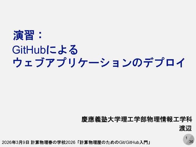 1 36 演習: 慶應義塾大学理工学部物理情報工学科 渡辺 2026年3月9日 計算物理春の学校2026「計算物理屋のためのGit/GitHub入門」 GitHubによる ウェブアプリケーションのデプロイ
