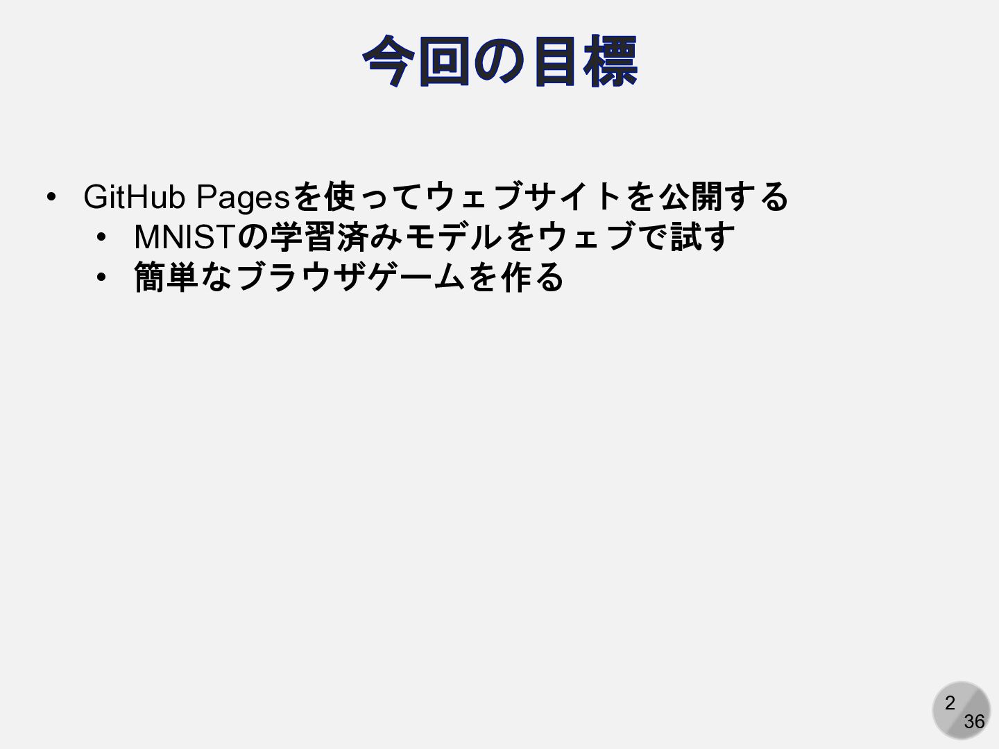 2 36 今回の目標 • GitHub Pagesを使ってウェブサイトを公開する • MNISTの学習済みモデルをウェブで試す • 簡単なブラウザゲームを作る