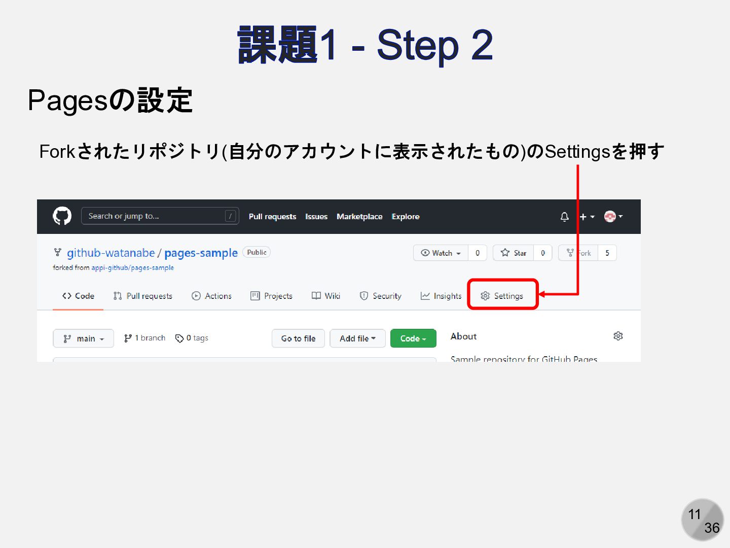 11 36 課題1 - Step 2 Pagesの設定 Forkされたリポジトリ(自分のアカウントに表示されたもの)のSettingsを押す