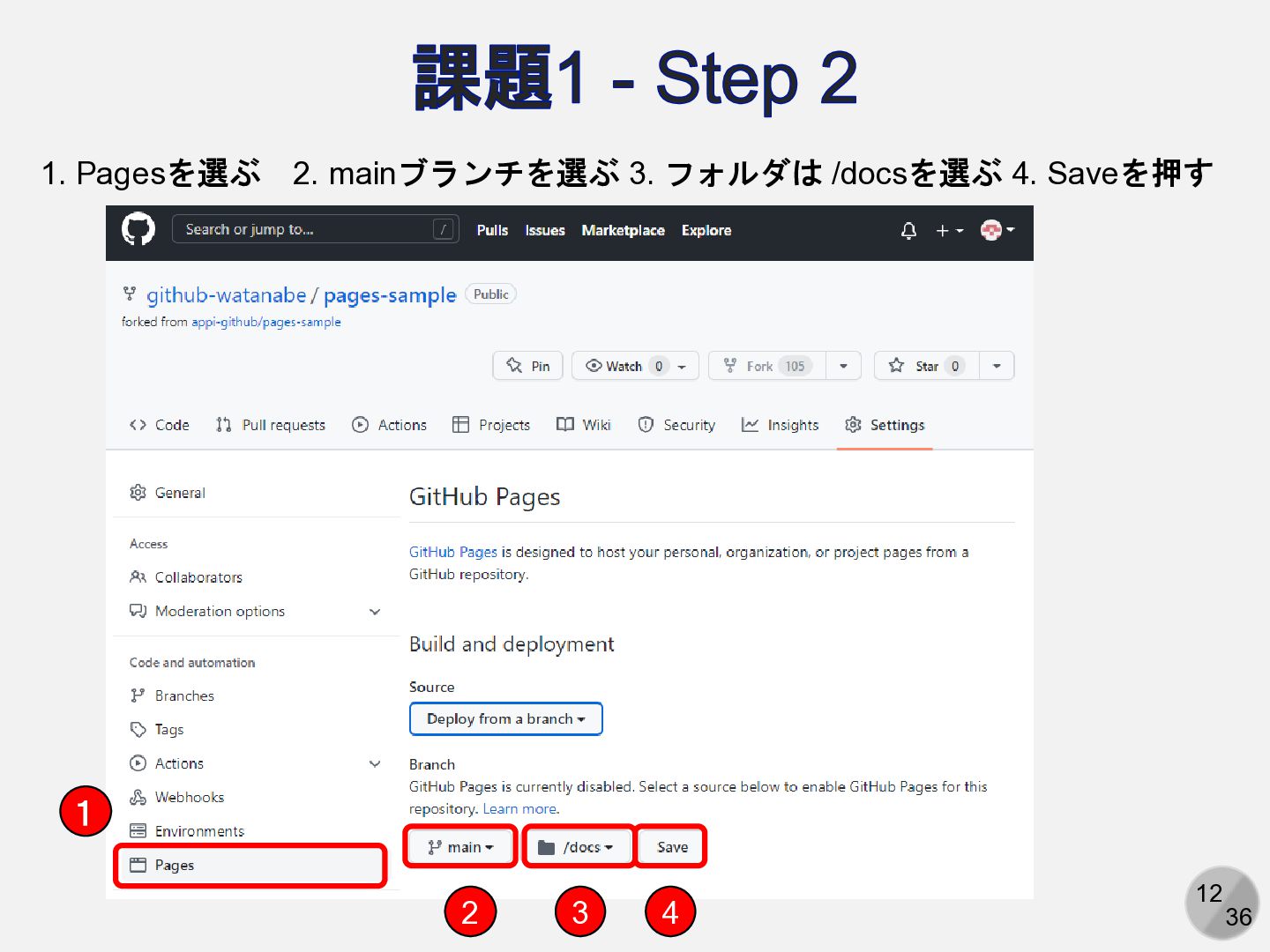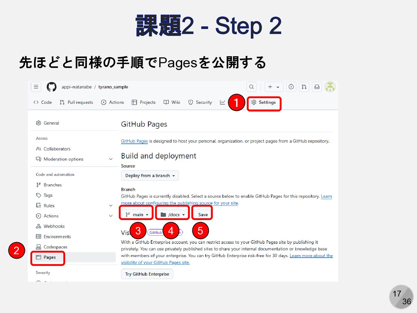 17 36 課題2 - Step 2 先ほどと同様の手順でPagesを公開する 1 2 3