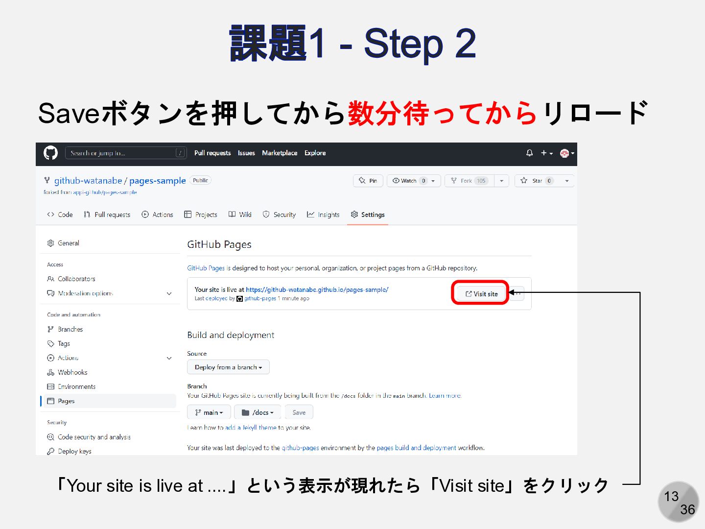 13 36 課題1 - Step 2 Saveボタンを押してから数分待ってからリロード 「Your site is