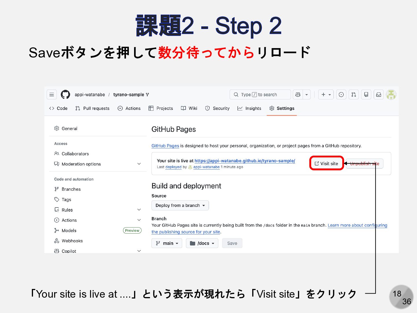18 36 課題2 - Step 2 Saveボタンを押して数分待ってからリロード 「Your site is