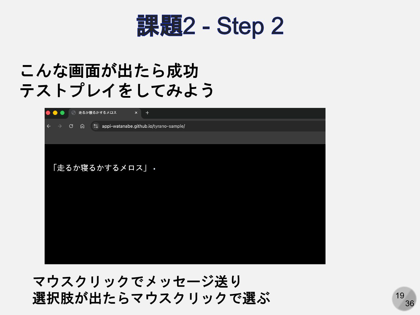 19 36 課題2 - Step 2 こんな画面が出たら成功 テストプレイをしてみよう マウスクリックでメッセージ送り 選択肢が出たらマウスクリックで選ぶ