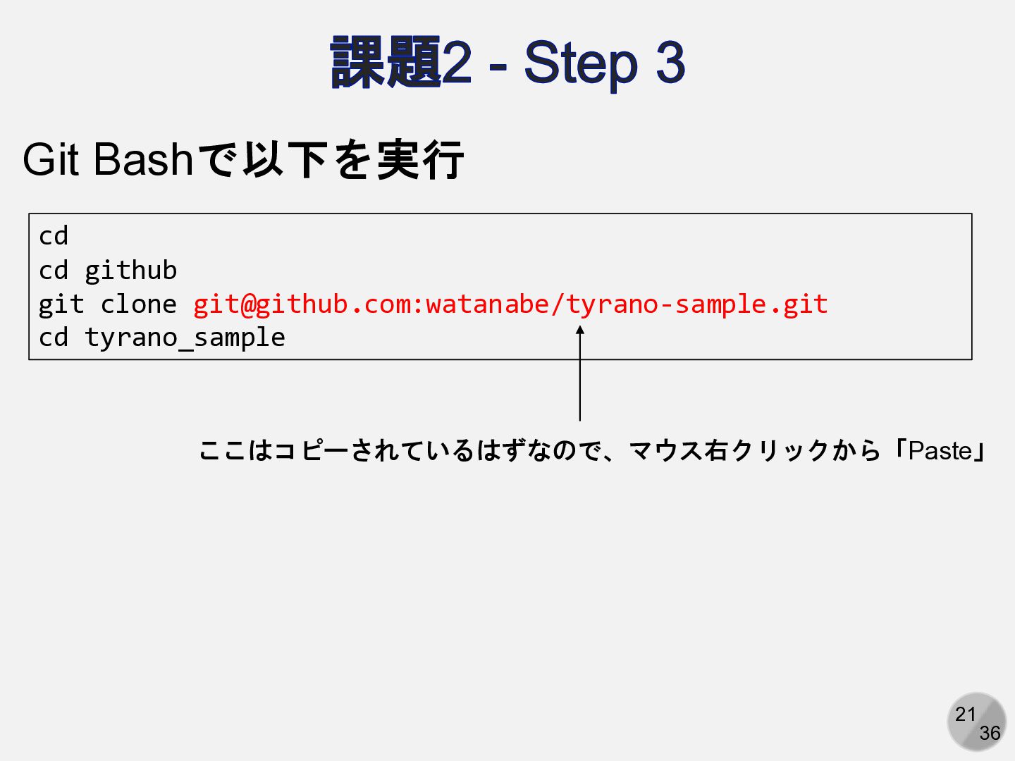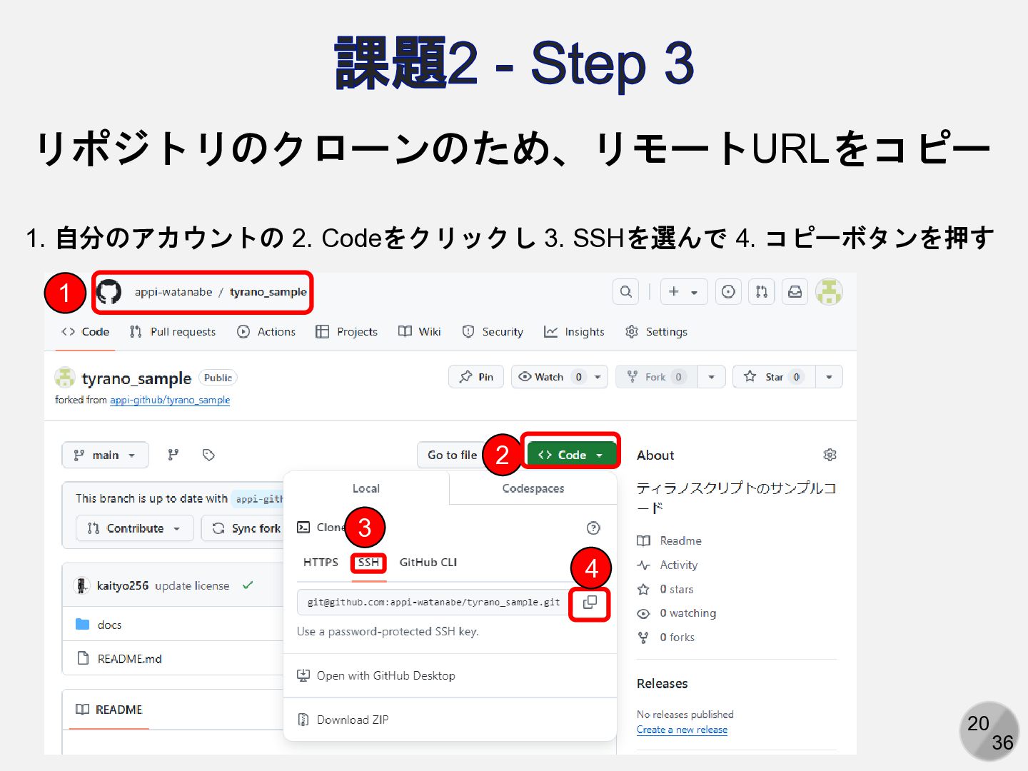 20 36 課題2 - Step 3 リポジトリのクローンのため、リモートURLをコピー 1 2 3