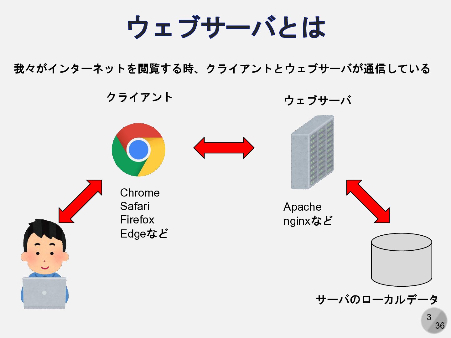 3 36 ウェブサーバとは 我々がインターネットを閲覧する時、クライアントとウェブサーバが通信している クライアント ウェブサーバ サーバのローカルデータ Chrome Safari Firefox