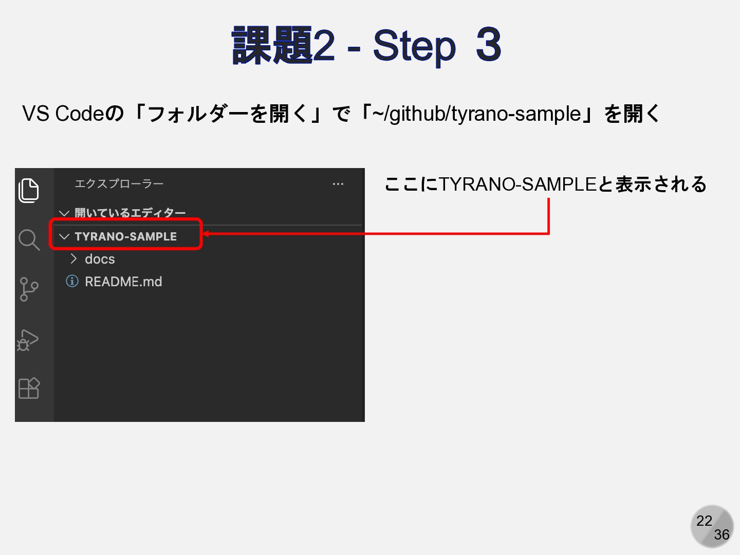 22 36 課題2 - Step 3 VS Codeの「フォルダーを開く」で「~/github/tyrano-sample」を開く ここにTYRANO-SAMPLEと表示される