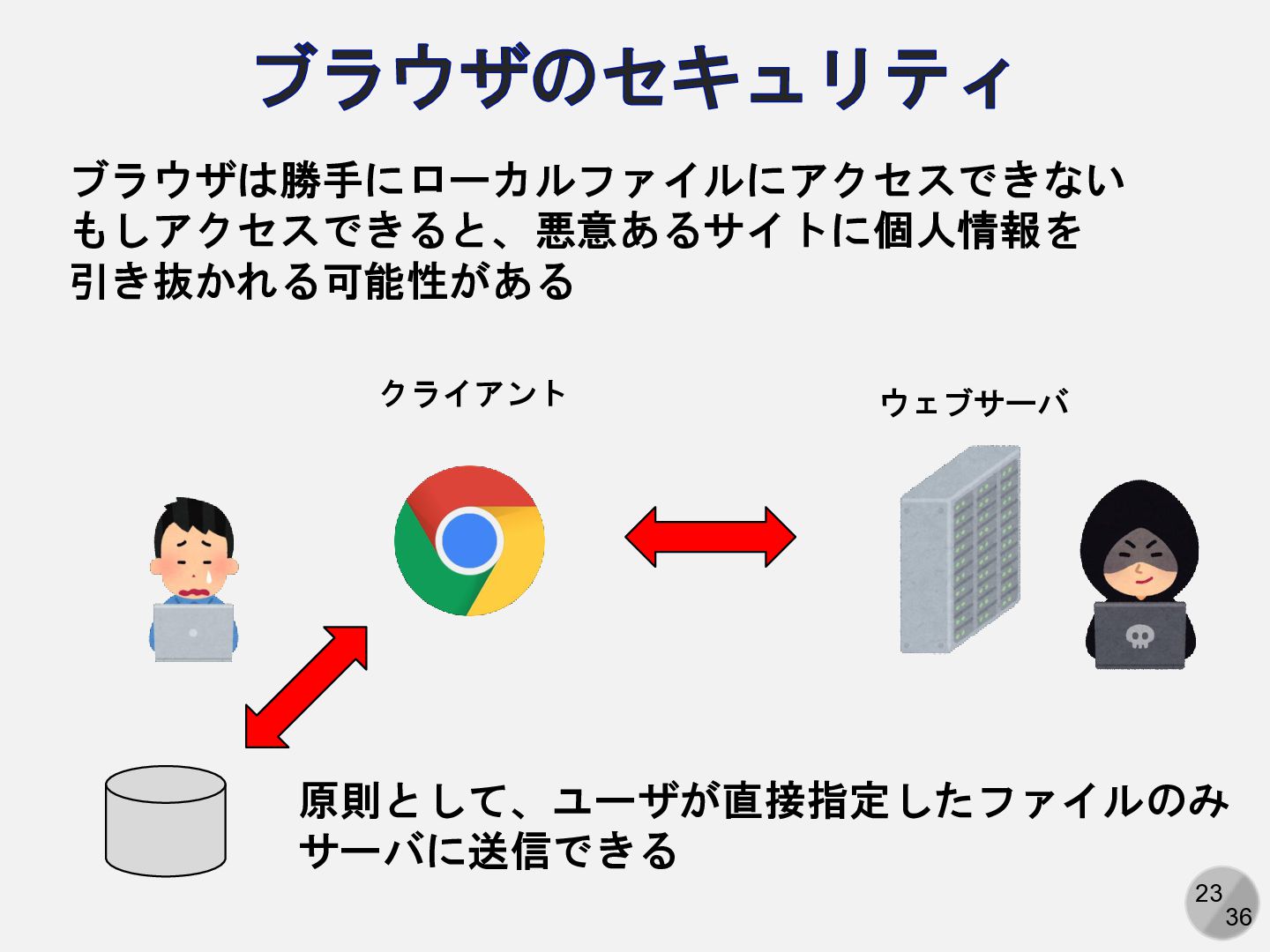 23 36 ブラウザのセキュリティ ブラウザは勝手にローカルファイルにアクセスできない もしアクセスできると、悪意あるサイトに個人情報を 引き抜かれる可能性がある クライアント ウェブサーバ 原則として、ユーザが直接指定したファイルのみ サーバに送信できる