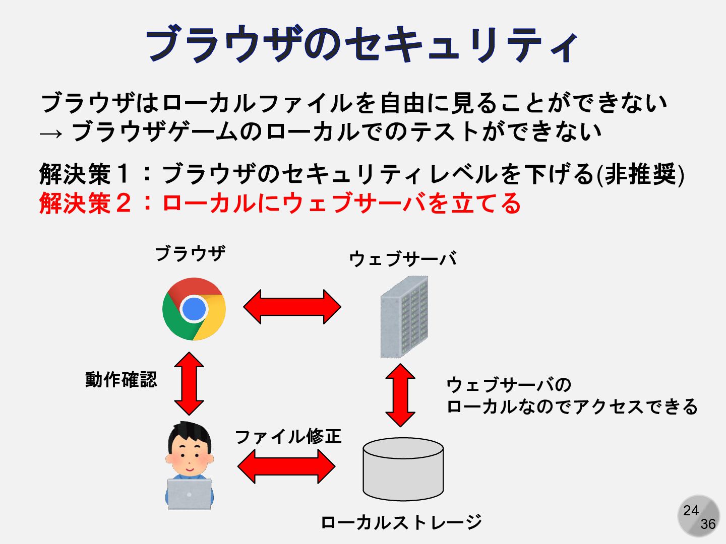 24 36 ブラウザのセキュリティ ブラウザはローカルファイルを自由に見ることができない → ブラウザゲームのローカルでのテストができない 解決策1:ブラウザのセキュリティレベルを下げる(非推奨) 解決策2:ローカルにウェブサーバを立てる ローカルストレージ ウェブサーバ