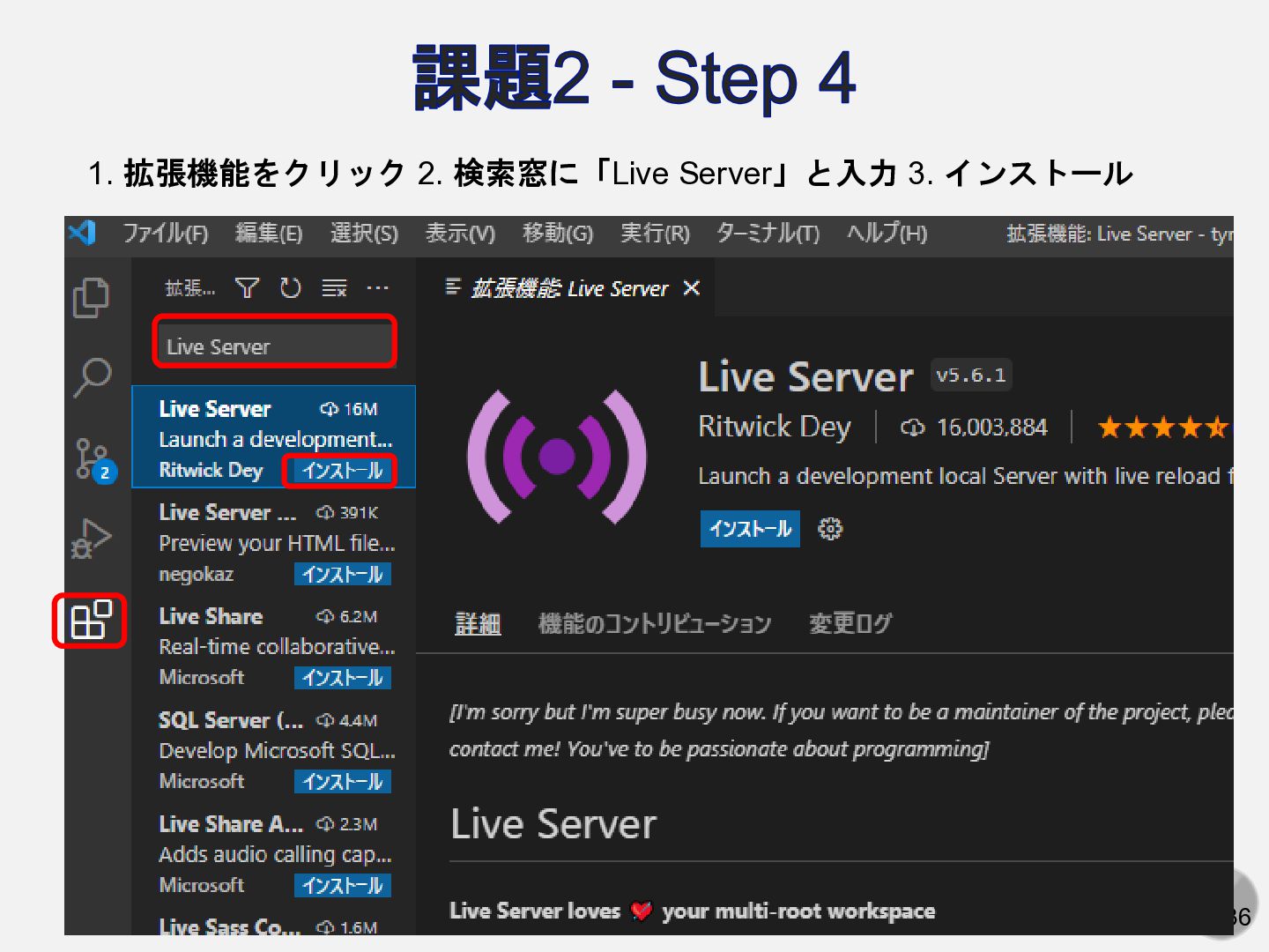 25 36 課題2 - Step 4 1. 拡張機能をクリック 2. 検索窓に「Live