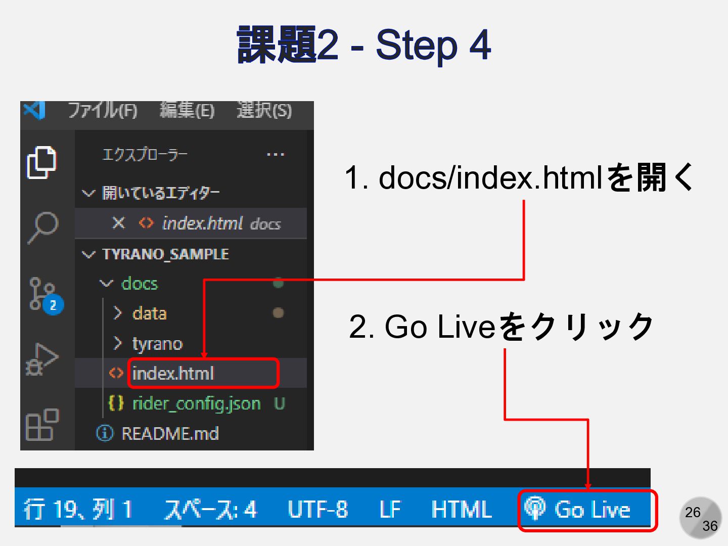 26 36 課題2 - Step 4 1. docs/index.htmlを開く 2. Go