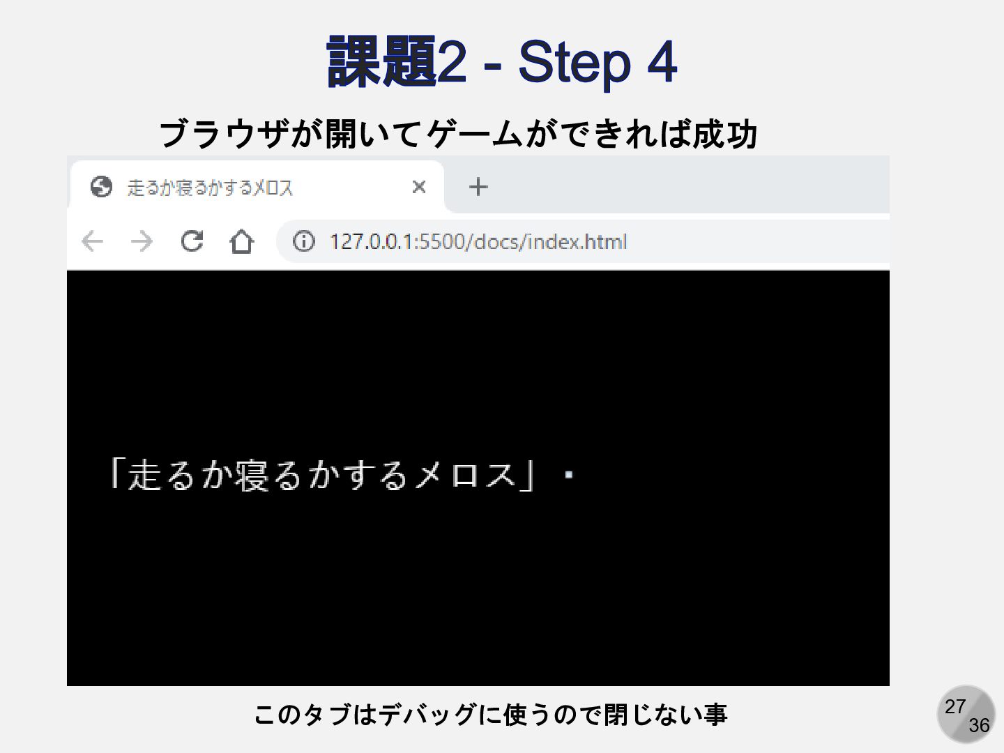 27 36 課題2 - Step 4 ブラウザが開いてゲームができれば成功 このタブはデバッグに使うので閉じない事