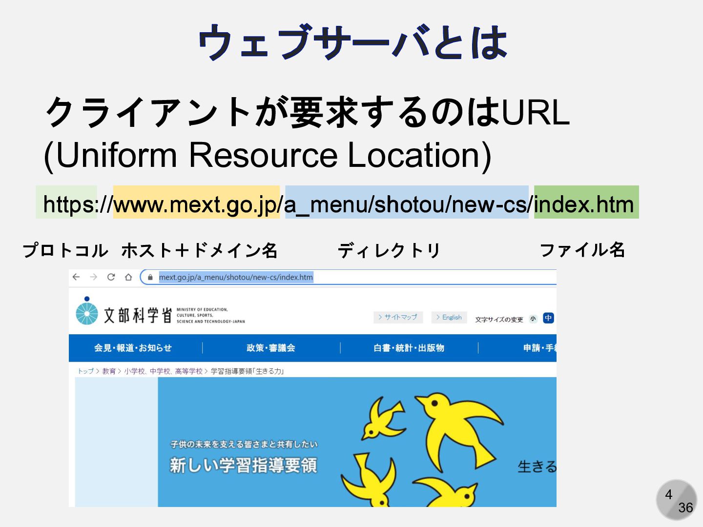 5 36 ウェブサーバとは https://www.mext.go.jp/a_menu/shotou/new-cs/index.htm プロトコル ホスト+ドメイン名 ディレクトリ ファイル名 https://www.mext.go.jp/a_menu/shotou/new-cs/index.htm 1.
