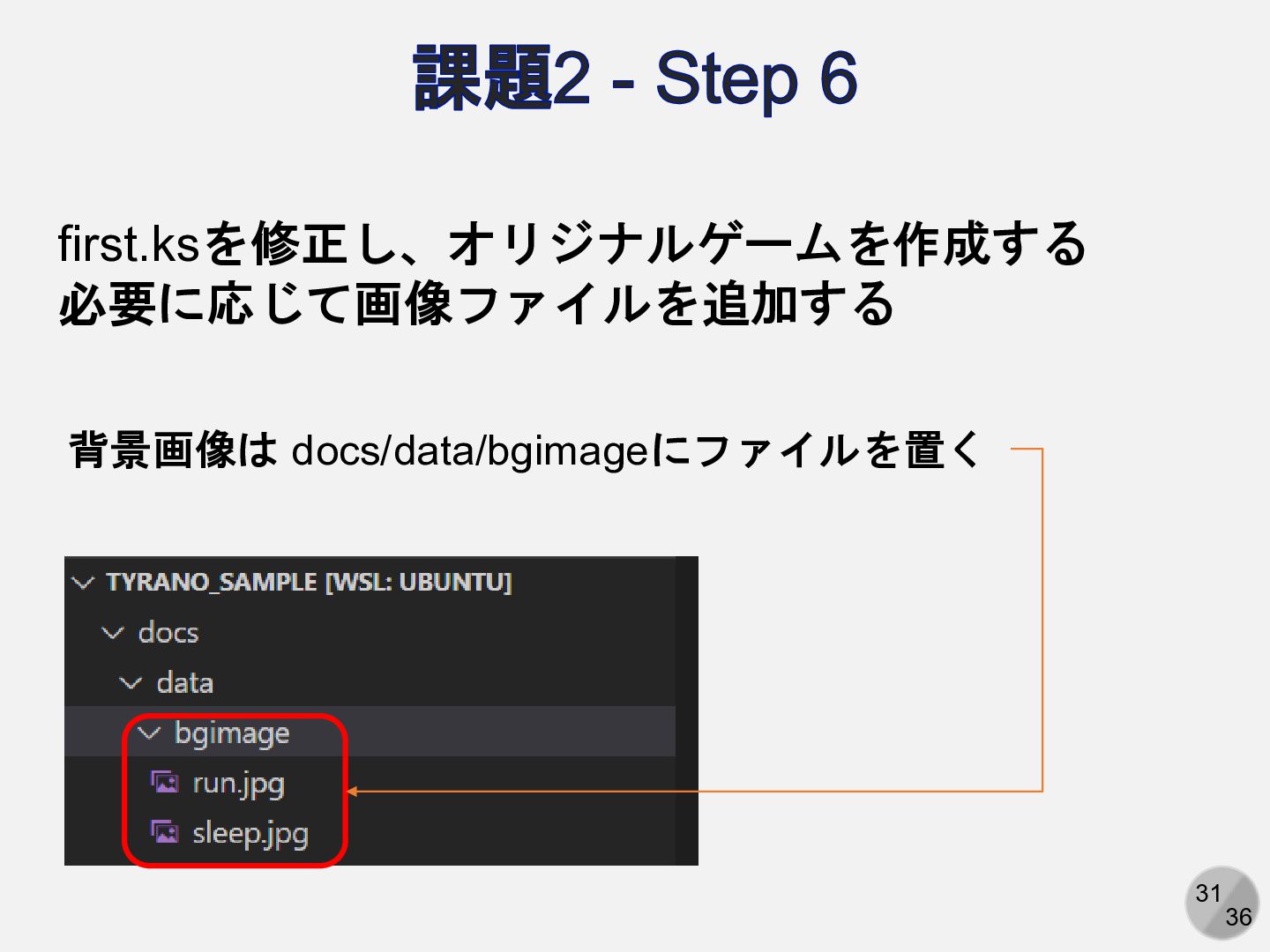31 36 課題2 - Step 6 first.ksを修正し、オリジナルゲームを作成する 必要に応じて画像ファイルを追加する 背景画像は docs/data/bgimageにファイルを置く