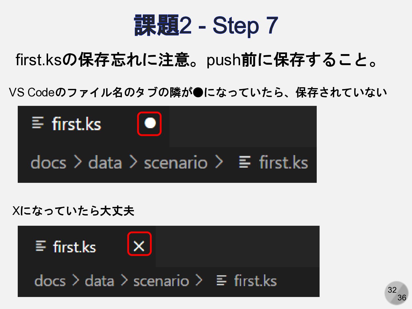 32 36 課題2 - Step 7 first.ksの保存忘れに注意。push前に保存すること。 VS Codeのファイル名のタブの隣が•になっていたら、保存されていない Xになっていたら大丈夫