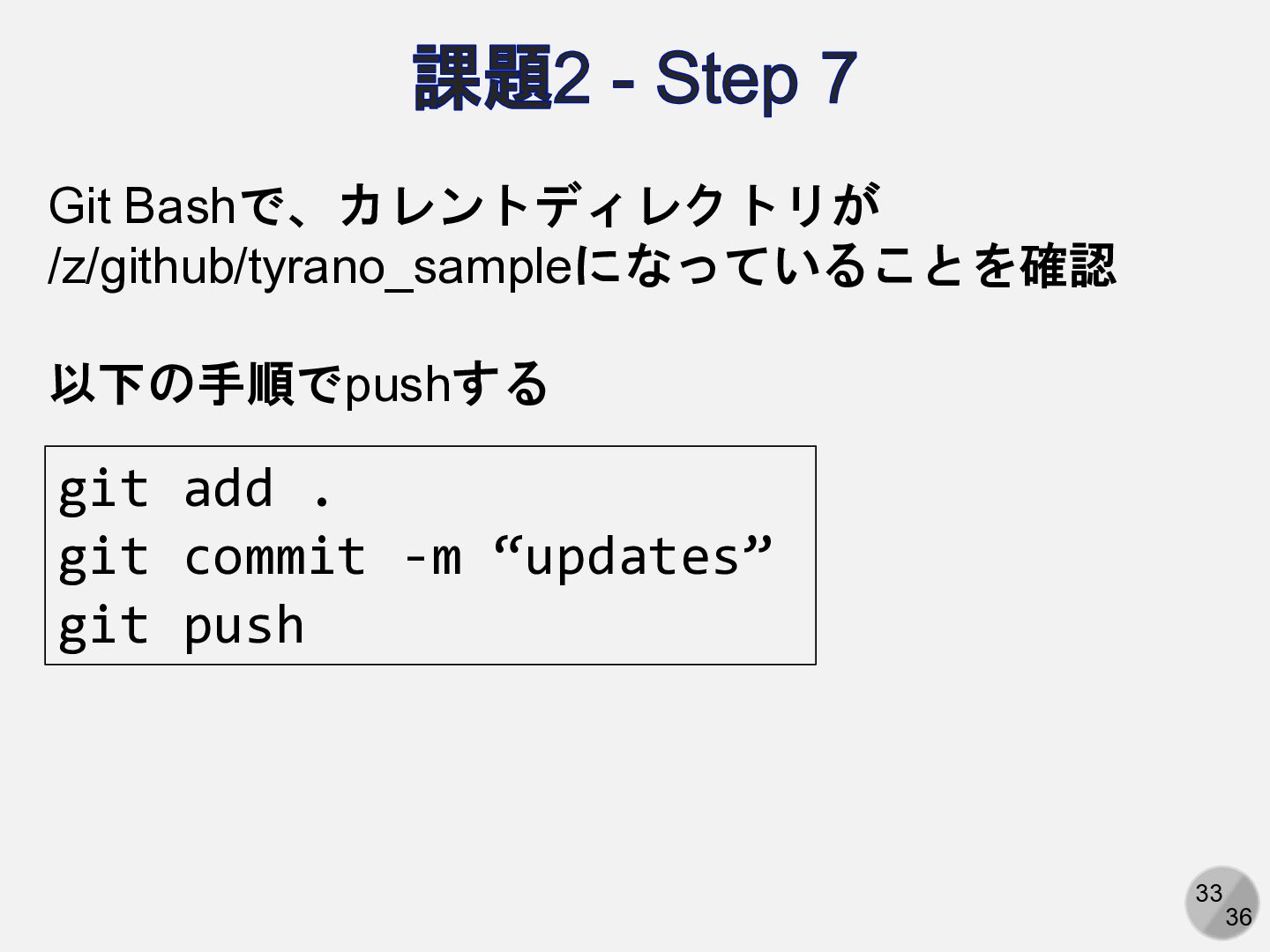 33 36 課題2 - Step 7 Git Bashで、カレントディレクトリが /z/github/tyrano_sampleになっていることを確認 以下の手順でpushする