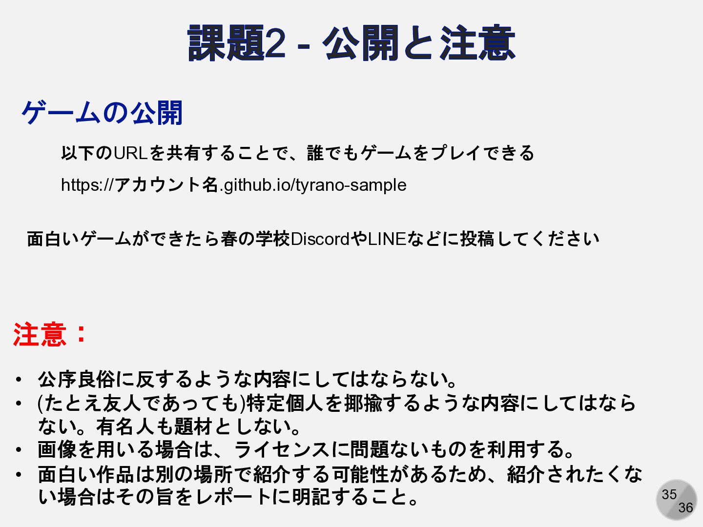 • 画像を用いる場合は、ライセンスに問題ないものを利用する。 • 面白い作品は別の場所で紹介する可能性があるため、紹介されたくな い場合はその旨をレポートに明記すること。 注意: ゲームの公開 https://アカウント名.github.io/tyrano-sample 以下のURLを共有することで、誰でもゲームをプレイできる 面白いゲームができたら春の学校DiscordやLINEなどに投稿してください