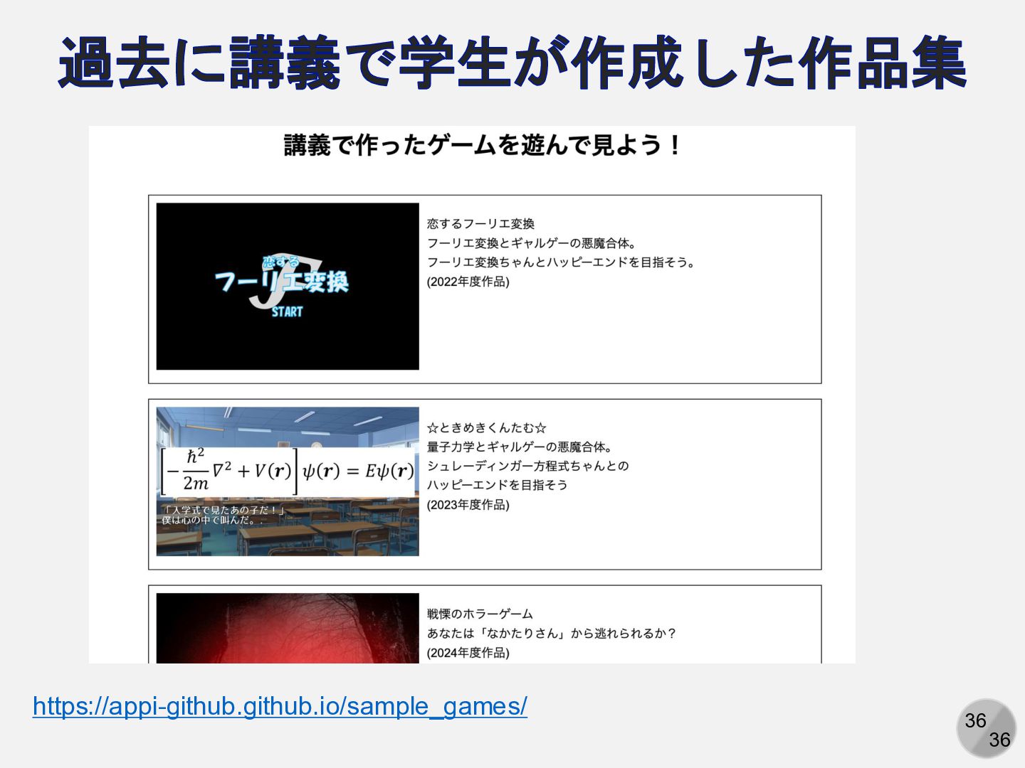 36 36 過去に講義で学生が作成した作品集 https://appi-github.github.io/sample_games/