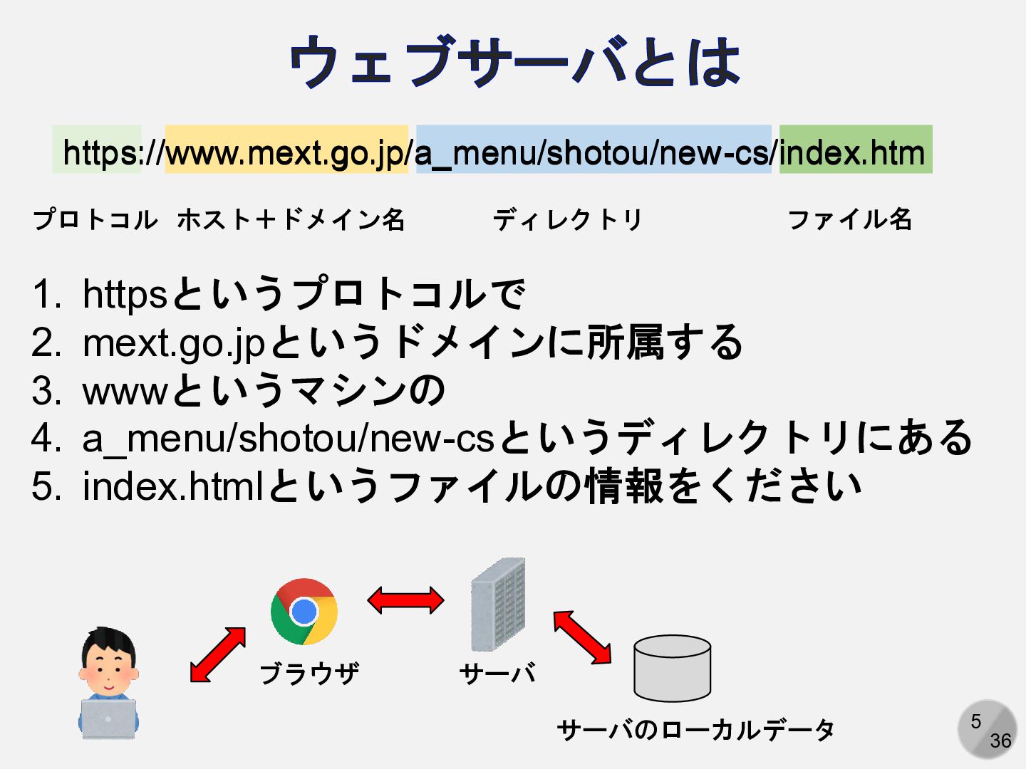 httpsというプロトコルで 2. mext.go.jpというドメインに所属する 3. wwwというマシンの 4. a_menu/shotou/new-csというディレクトリにある 5. index.htmlというファイルの情報をください サーバのローカルデータ サーバ ブラウザ