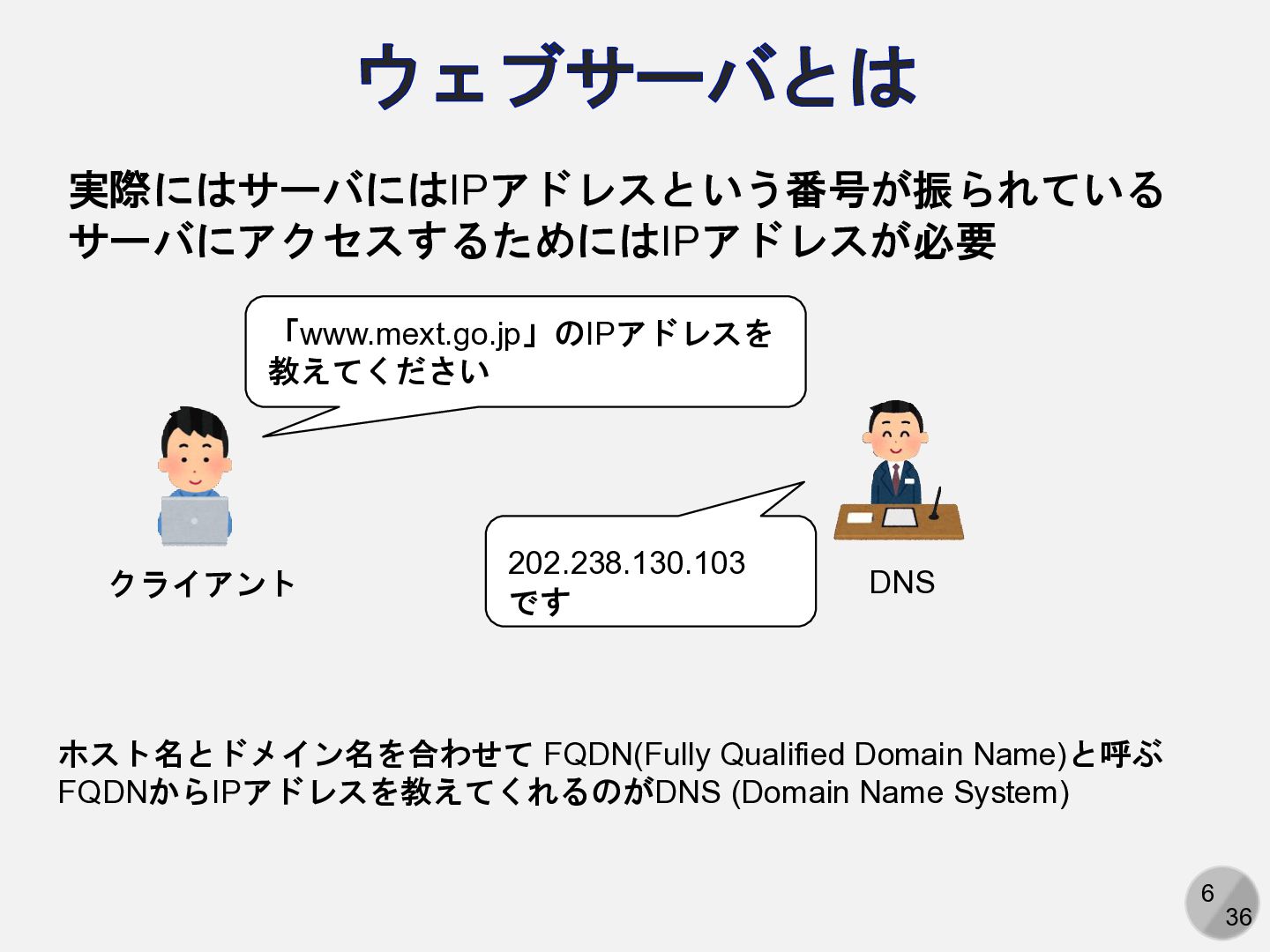 6 36 ウェブサーバとは 実際にはサーバにはIPアドレスという番号が振られている サーバにアクセスするためにはIPアドレスが必要 「www.mext.go.jp」のIPアドレスを 教えてください 202.238.130.103 です ホスト名とドメイン名を合わせて