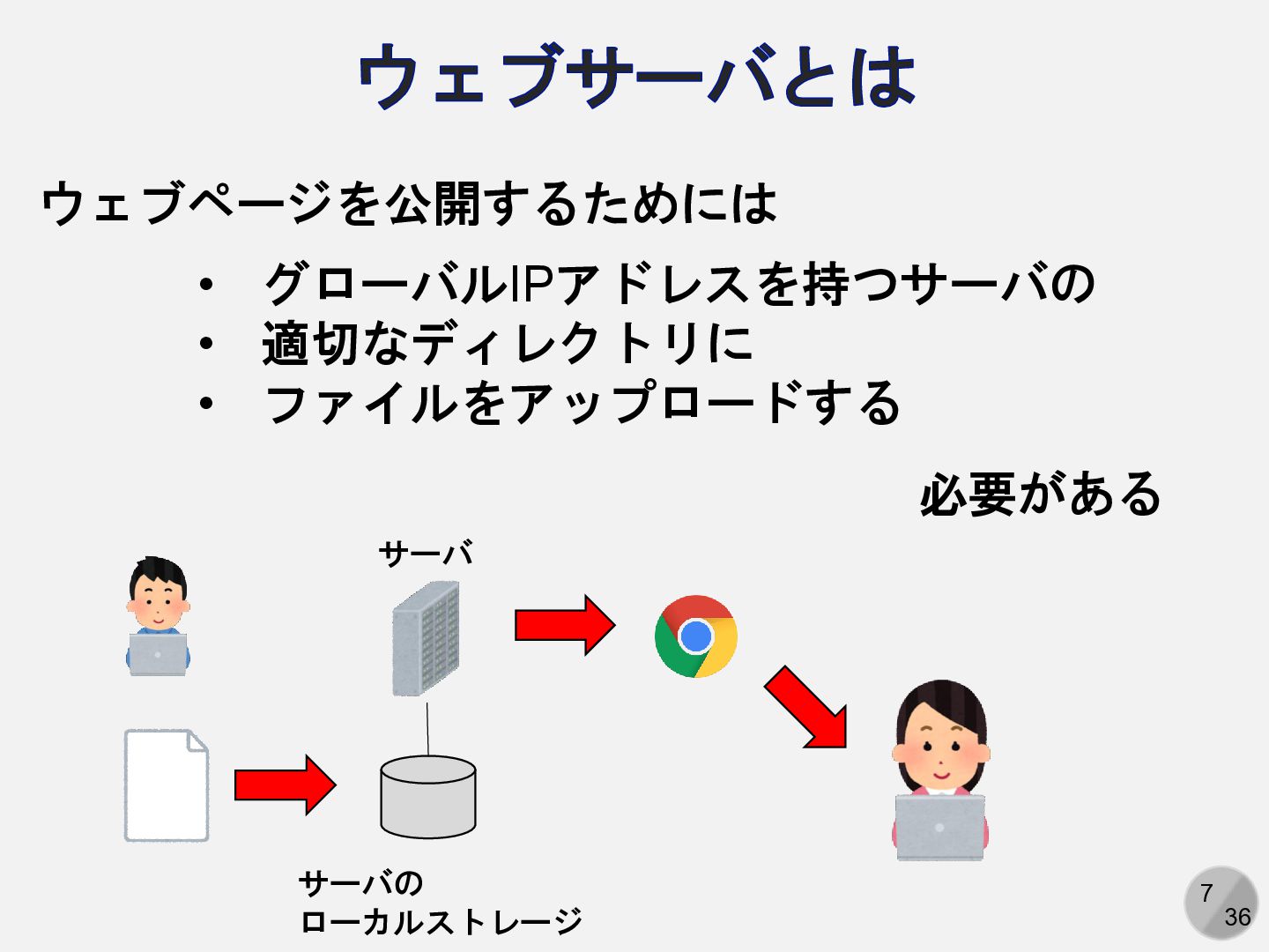 7 36 ウェブサーバとは ウェブページを公開するためには • グローバルIPアドレスを持つサーバの • 適切なディレクトリに • ファイルをアップロードする