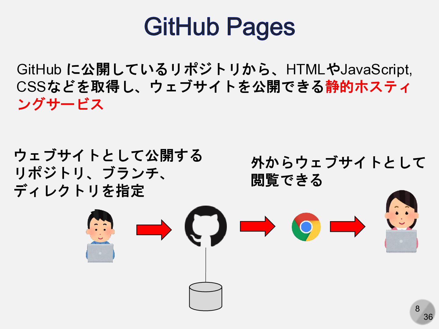 8 36 GitHub Pages GitHub に公開しているリポジトリから、HTMLやJavaScript, CSSなどを取得し、ウェブサイトを公開できる静的ホスティ ングサービス 外からウェブサイトとして 閲覧できる