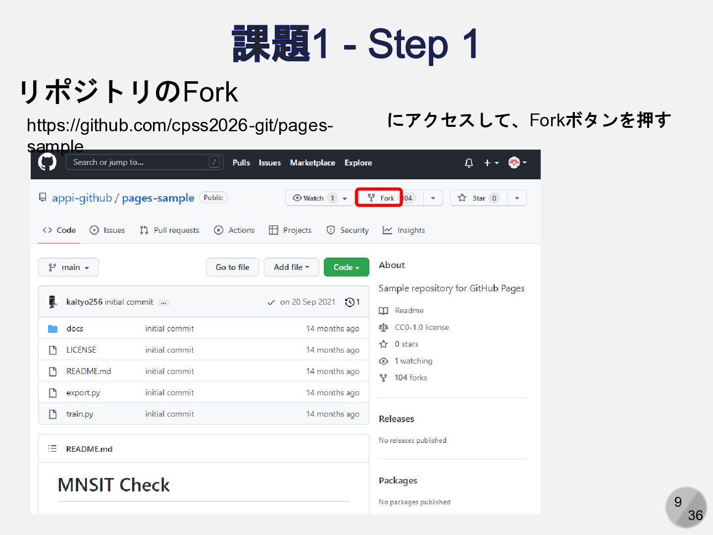 9 36 課題1 - Step 1 リポジトリのFork https://github.com/cpss2026-git/pages- sample にアクセスして、Forkボタンを押す