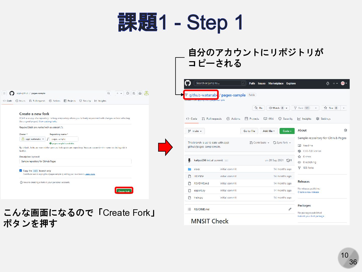 10 36 課題1 - Step 1 こんな画面になるので「Create Fork」 ボタンを押す 自分のアカウントにリポジトリが