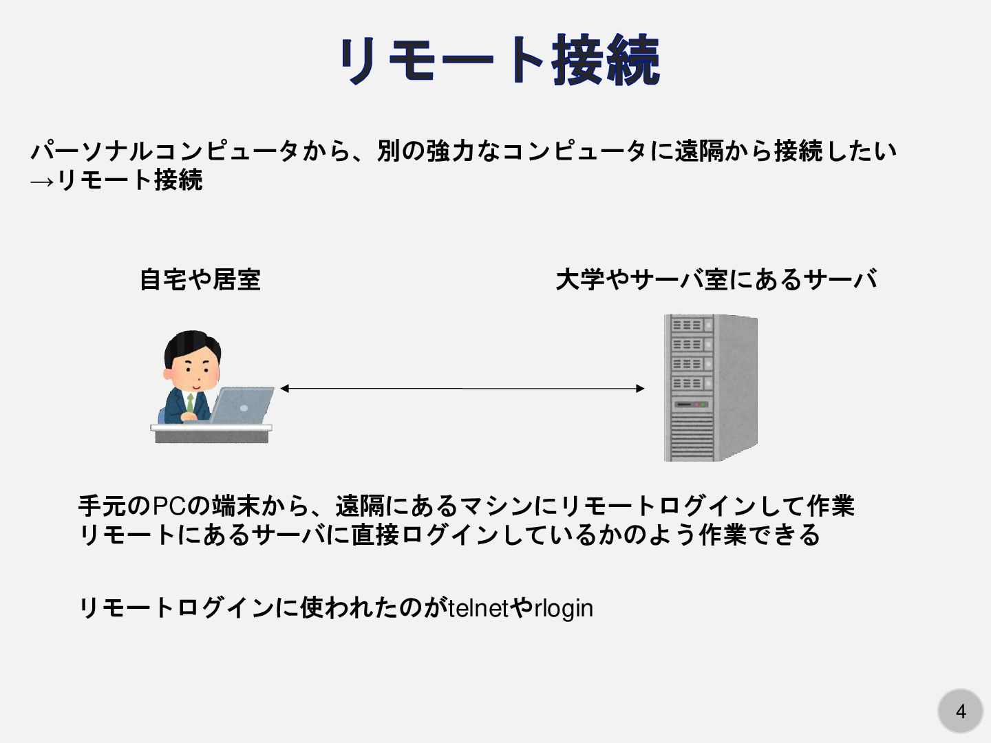 4 リモート接続 パーソナルコンピュータから、別の強力なコンピュータに遠隔から接続したい →リモート接続 自宅や居室 大学やサーバ室にあるサーバ 手元のPCの端末から、遠隔にあるマシンにリモートログインして作業 リモートにあるサーバに直接ログインしているかのよう作業できる リモートログインに使われたのがtelnetやrlogin