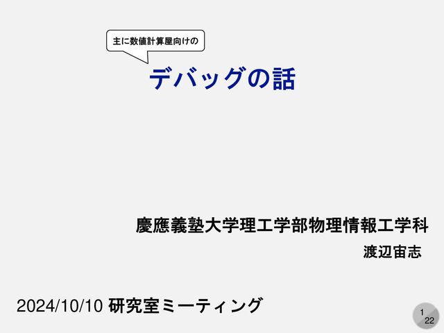 piyo(); hogehoge(); } こいつが死んだ int main(){ /* hoge(); fuga(); piyo(); hogehoge(); */ } すべてコメントアウト して動作確認※ int main(){ hoge(); fuga(); /* piyo(); hogehoge(); */ } 後半だけコメントアウ トして動作確認 ※「ここは絶対大丈夫」というところまで一度戻るのが大事 • ビルドに失敗しているのに気づかずに古い実行バイナリを見ていた • 間違ったライブラリをリンクしていた • そもそも実行方法を間違えていた 「ここは絶対大丈夫」がわり と大丈夫でなかったりする