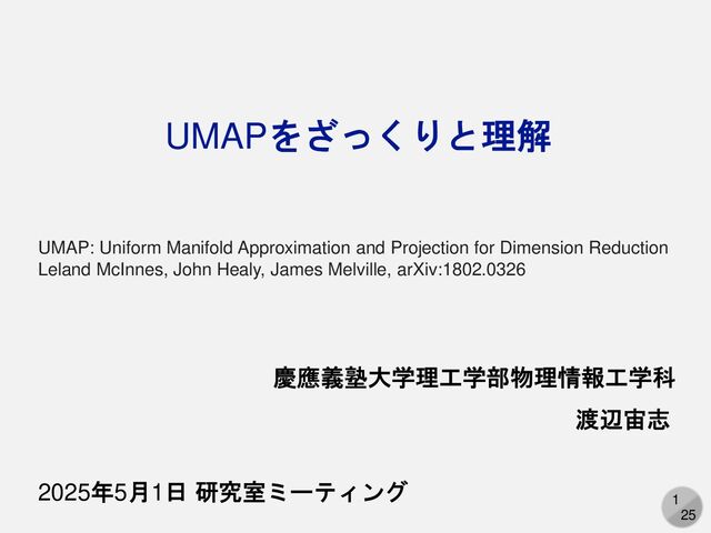 Ԧ 𝑥𝑗 2 /2𝜎𝑖 2) ガウス型 exp(−(𝑟𝑖𝑗 − 𝜌𝑖 )/𝜎𝑖 ) 指数関数型 低次元空間の重み t分布 𝑞𝑖𝑗 ∝ 1 + Ԧ 𝑦𝑖 − Ԧ 𝑦𝑗 2 −1 修正t分布 𝑞𝑖𝑗 ∝ 1 + 𝑎 Ԧ 𝑦𝑖 − Ԧ 𝑦𝑗 2𝑏 −1 𝑝𝑖𝑗 の構築 全データ点ペア 𝑝𝑖𝑗 の意味 点𝑖が近傍として 点𝑗を選ぶ確率 点𝑖, 𝑗間を結ぶエッジが 存在する確率 k個の近傍点についてのみ 対称化 𝑝𝑖𝑗 = 𝑝 𝑗 𝑖 + 𝑝(𝑖|𝑗) 2𝑁 幾何平均 𝑝𝑖𝑗 = 𝑝 𝑗 𝑖 + 𝑝 𝑖 𝑗 − 𝑝 𝑖 𝑗 𝑝 𝑖 𝑗 T-conorm