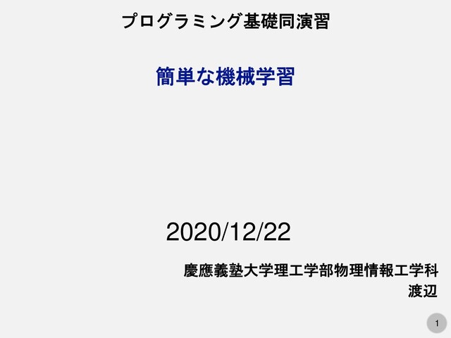 1 簡単な機械学習 プログラミング基礎同演習 慶應義塾大学理工学部物理情報工学科 渡辺 2020/12/22
